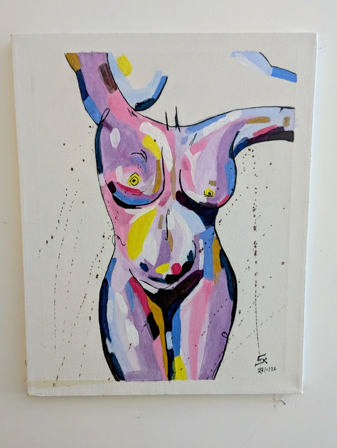 This is an abstract painting of a female, rendered with vibrant colours. The artwork features a mix of purple, pink, yellow, blue, and black hues. Signature and date "27/1/26" are visible on the bottom right. Size of painting 51cm * 40 cm.