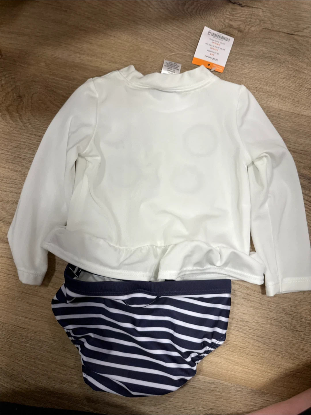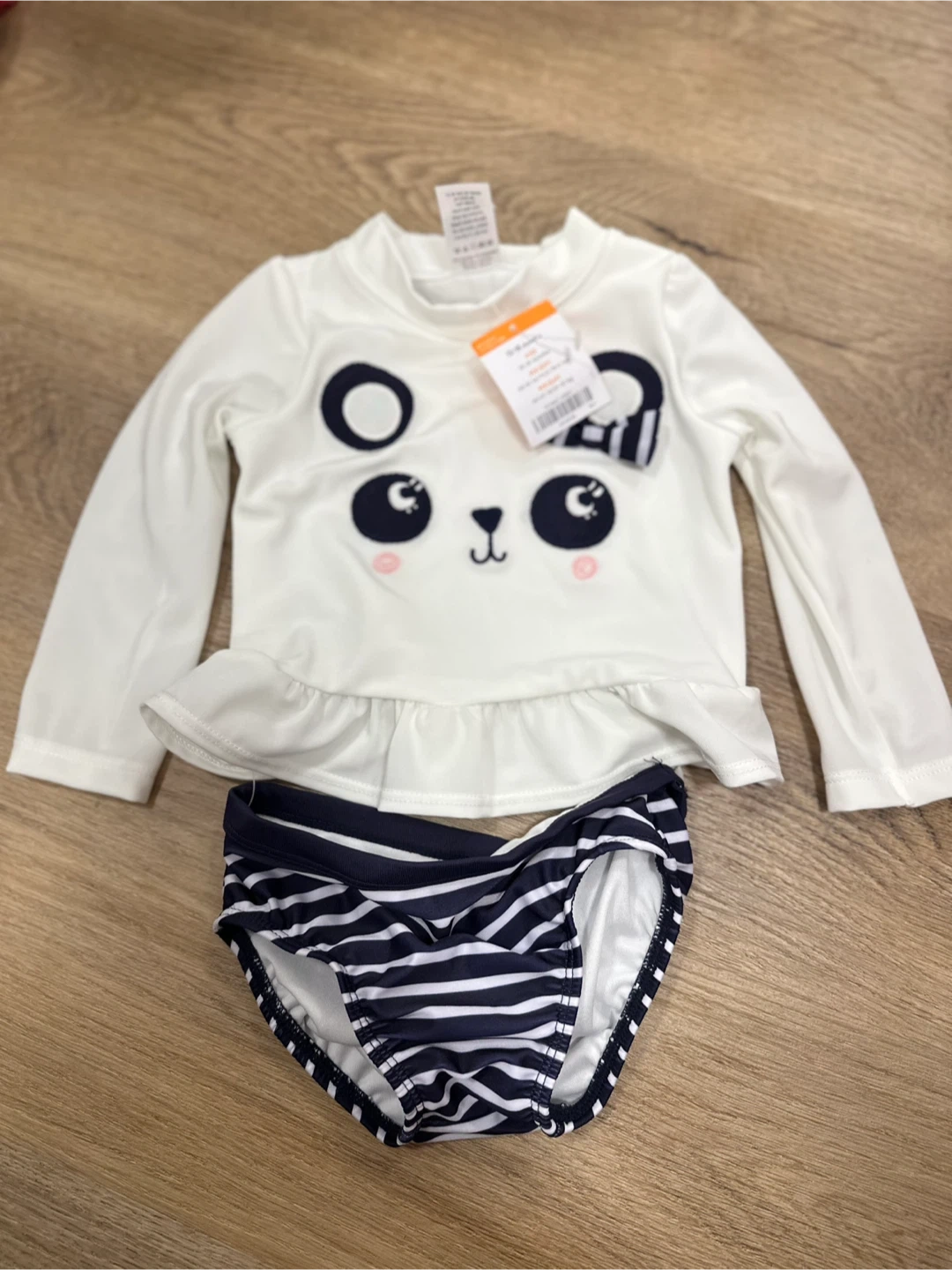 This long-sleeve rashguard and striped bottoms feature a cute panda face. It's sized for 12-18 months. Perfect for sun protection at the beach or pool! Pick up Walden