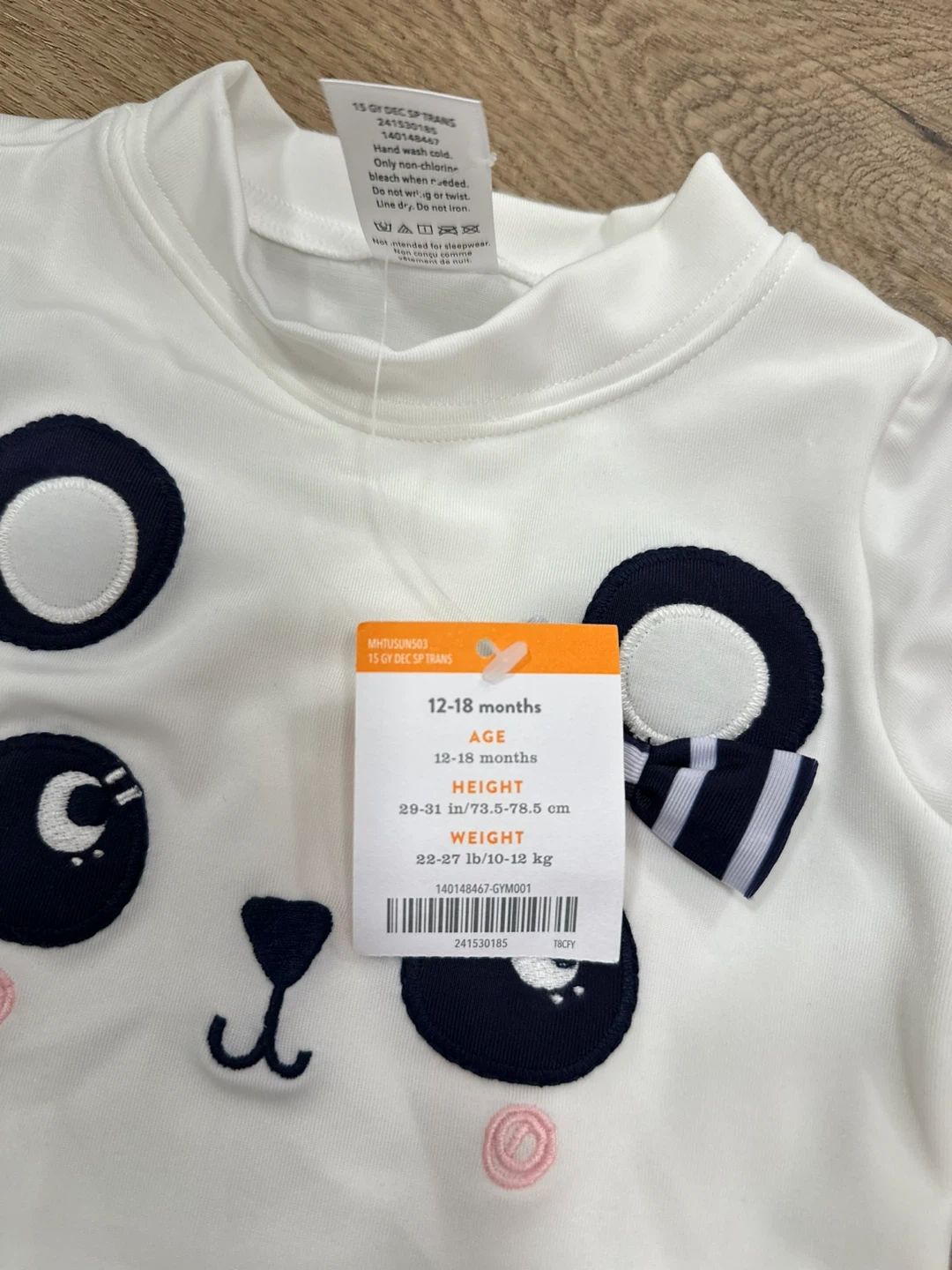 This long-sleeve rashguard and striped bottoms feature a cute panda face. It's sized for 12-18 months. Perfect for sun protection at the beach or pool! Pick up Walden