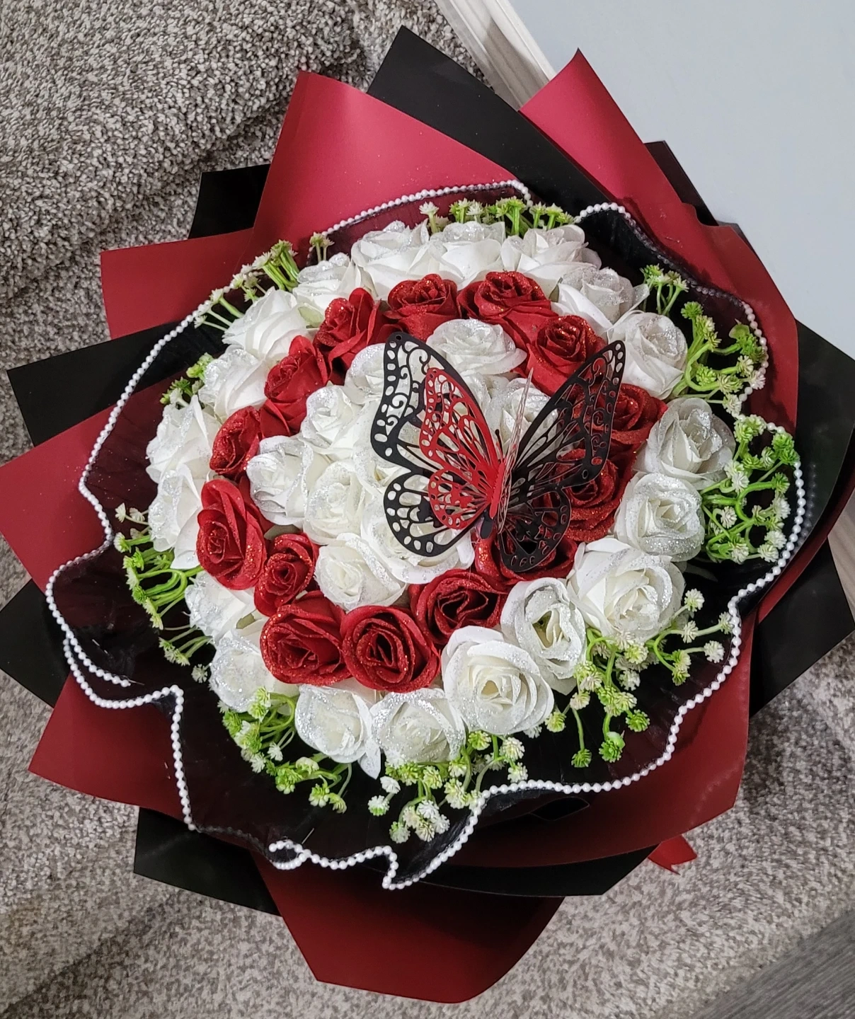 A lovely artificial rose bouquet featuring red and white glittered roses. It's accented with a decorative butterfly. This bouquet is perfect for special occasions or as a lasting decorative piece.
