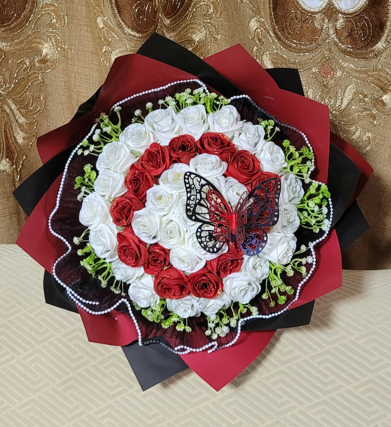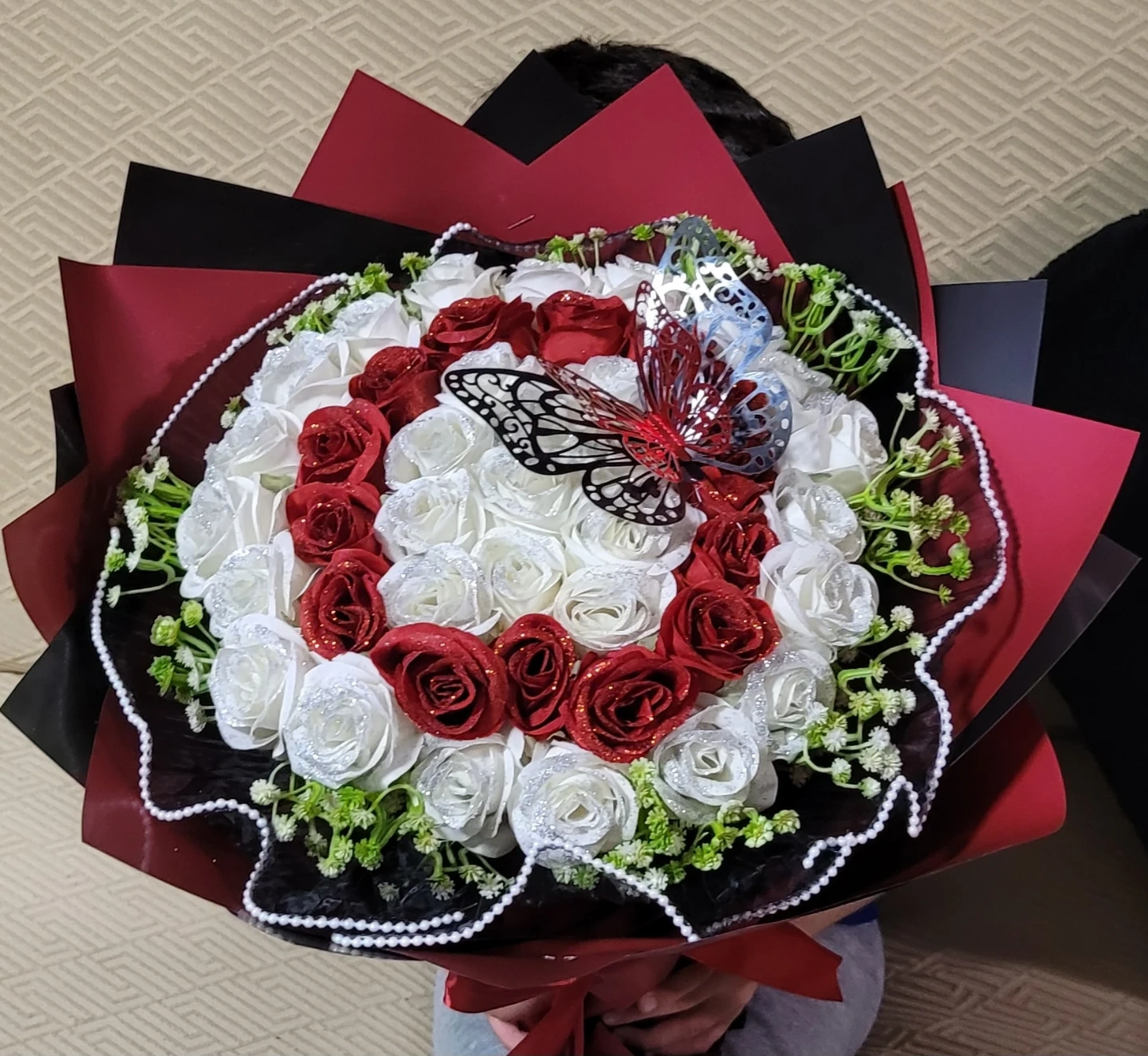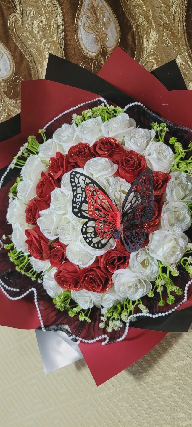 A lovely artificial rose bouquet featuring red and white glittered roses. It's accented with a decorative butterfly. This bouquet is perfect for special occasions or as a lasting decorative piece.