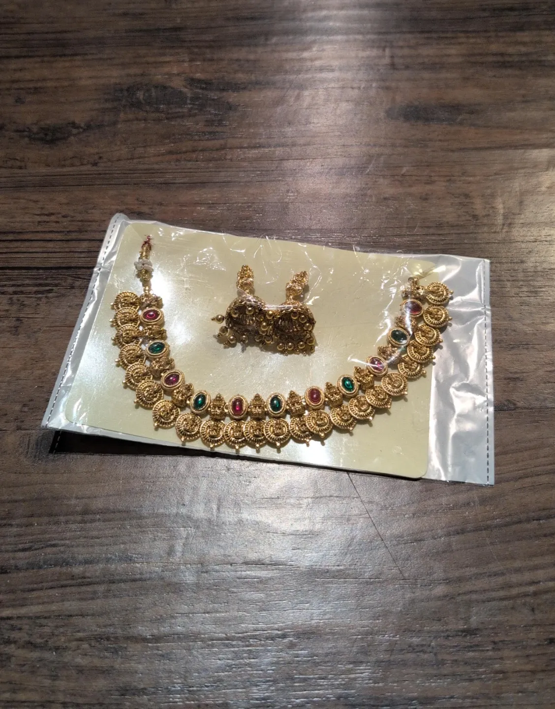 A gold-tone necklace and matching earrings are included. The set is embellished with red and green stones. This jewelry set adds a vibrant touch to any outfit.