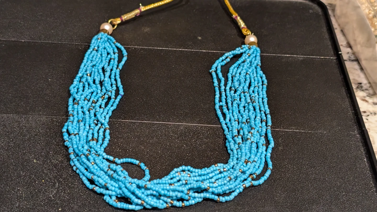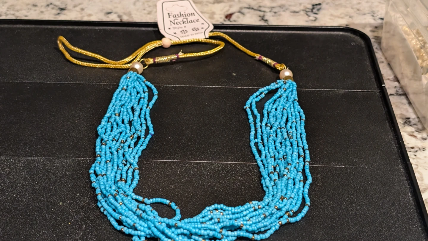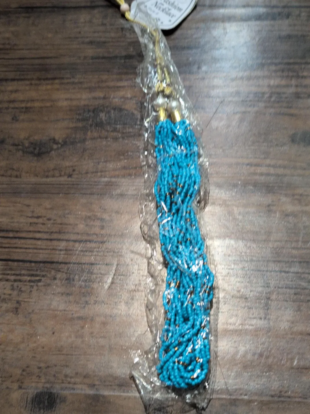 Fashion necklace with small turquoise beads and gold accents. It's a layered beaded design. This necklace would add a pop of colour to any outfit. It's great for casual wear.