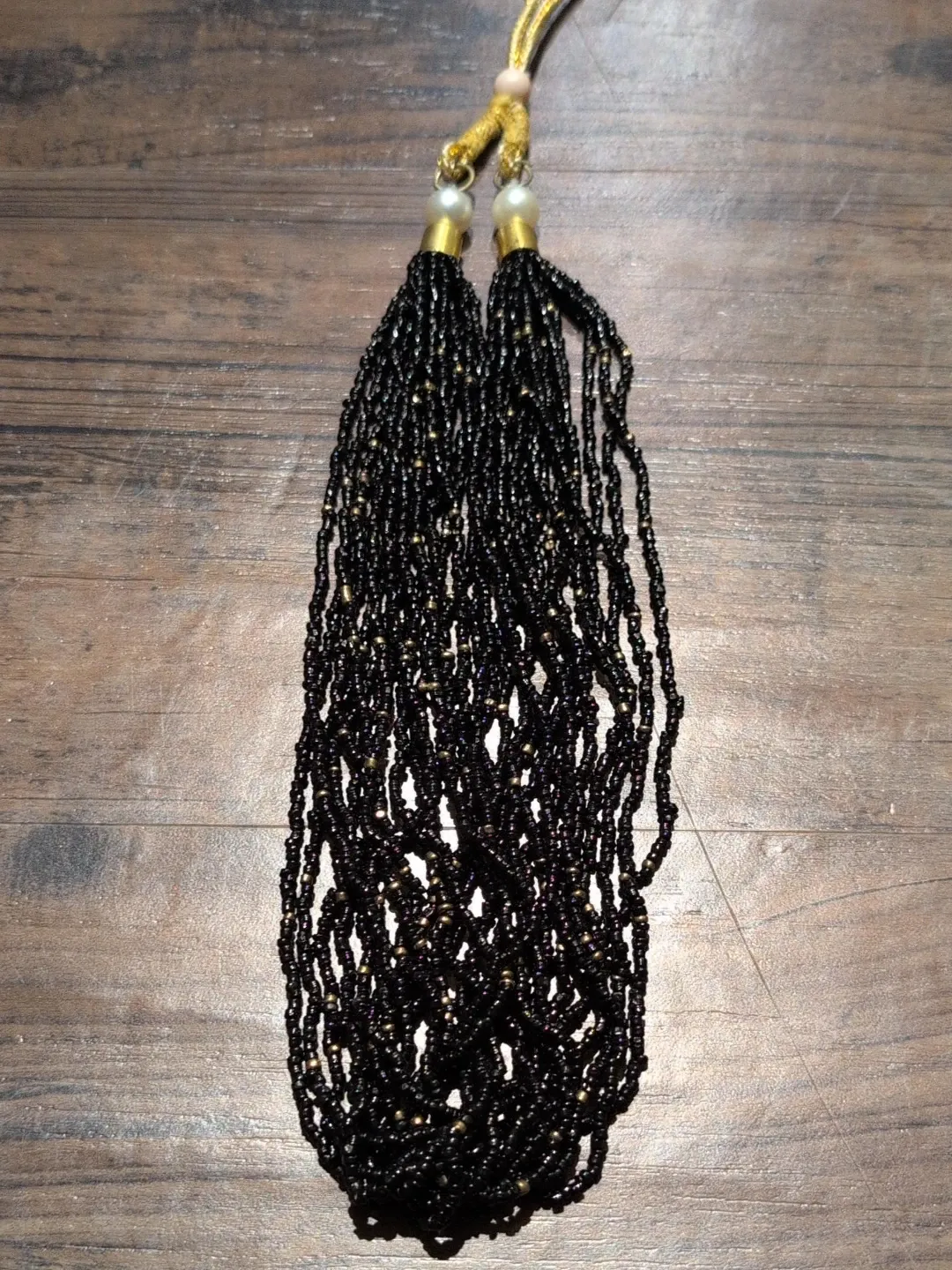 This necklace features strands of small black beads interspersed with tiny gold beads. It has a layered look with tassels at each end. A classic accessory for adding a touch of elegance to an outfit!