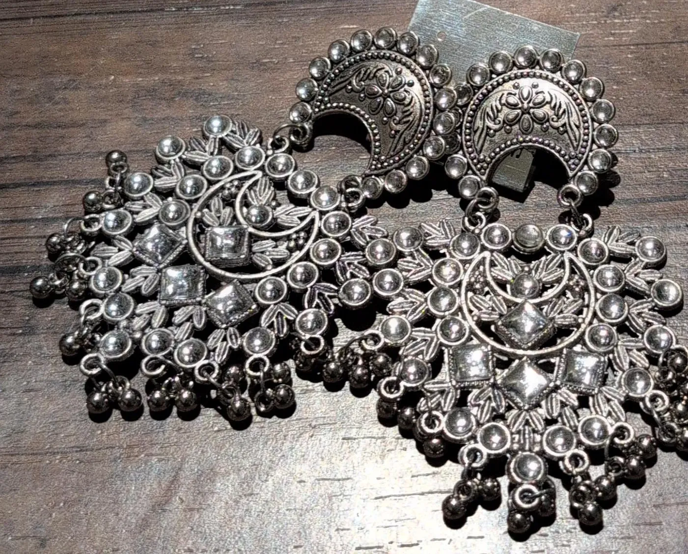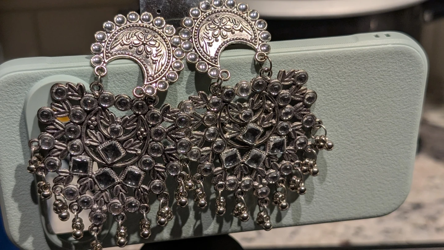 These silver oxidized jhumka earrings feature a detailed floral and crescent moon design. They're adorned with clear stones and small dangling beads. Great for adding a touch of ethnic flair to an outfit!