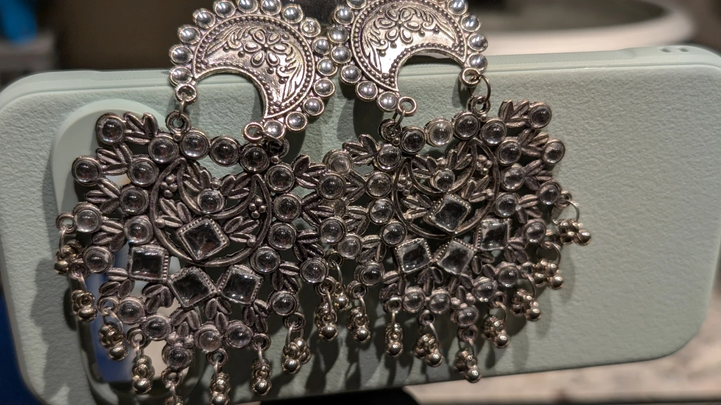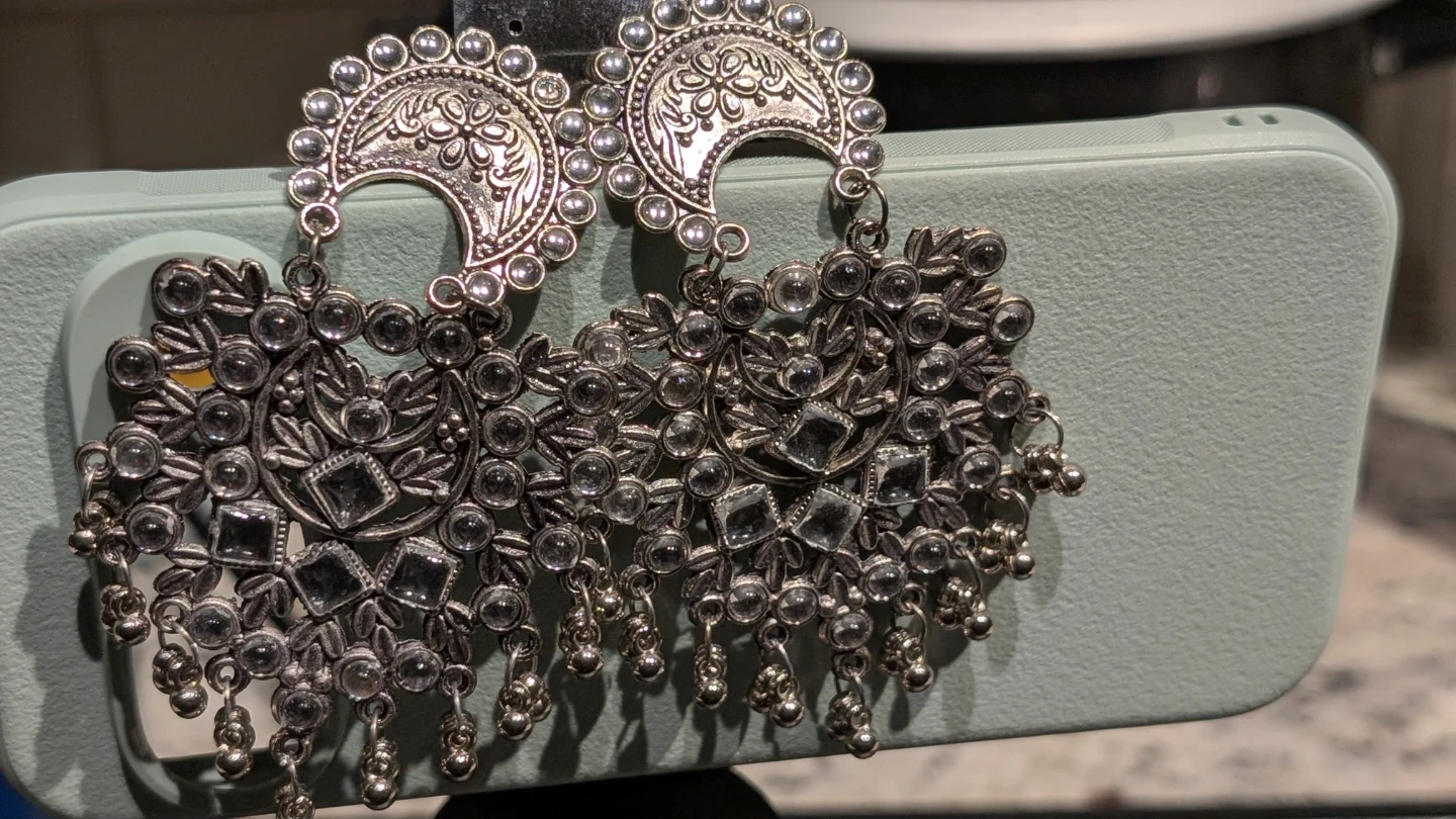 These silver oxidized jhumka earrings feature a detailed floral and crescent moon design. They're adorned with clear stones and small dangling beads. Great for adding a touch of ethnic flair to an outfit!