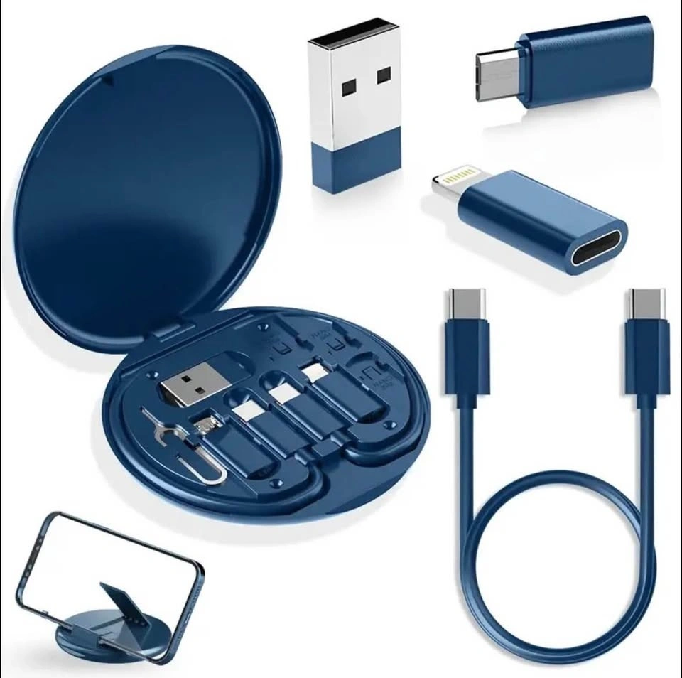 5-in-1 Mini USB Adapter Kit with multi charging cables, in a cable storage box. Includes 60W fast charging USB cable set, silicone Type-C adapter, and card slot for data transmission. Also features a storage card, tray pop-up screw, and a phone holder stand.