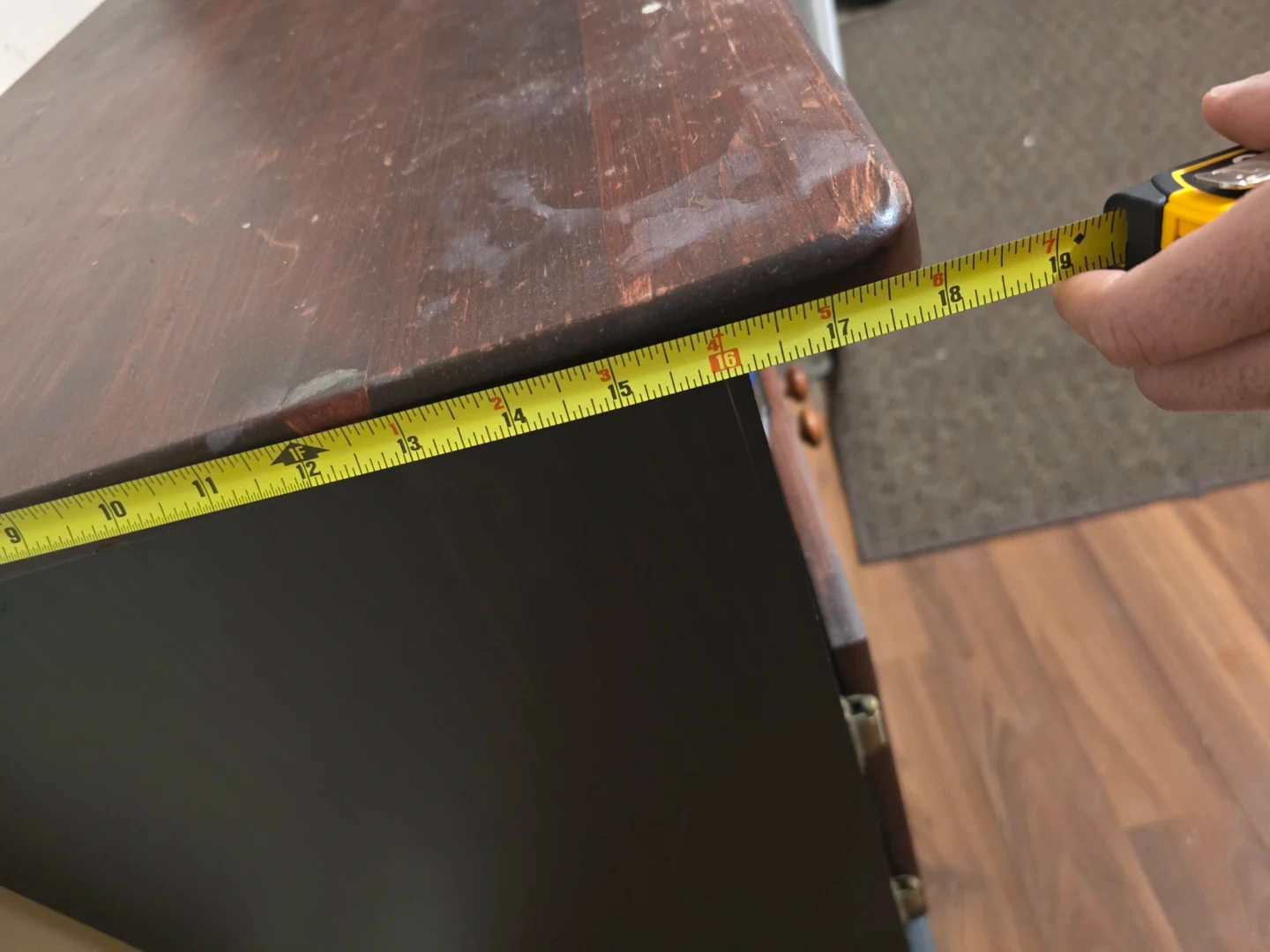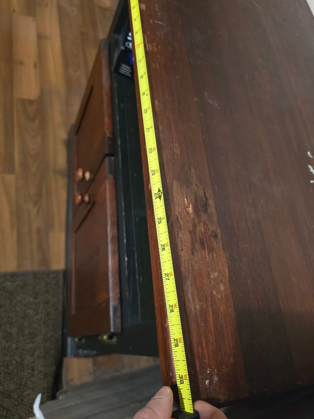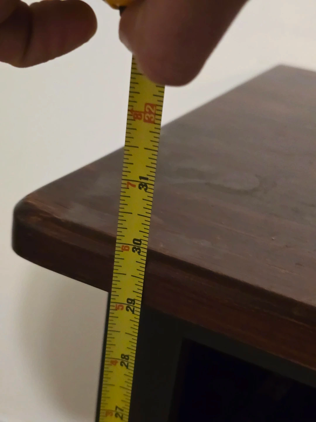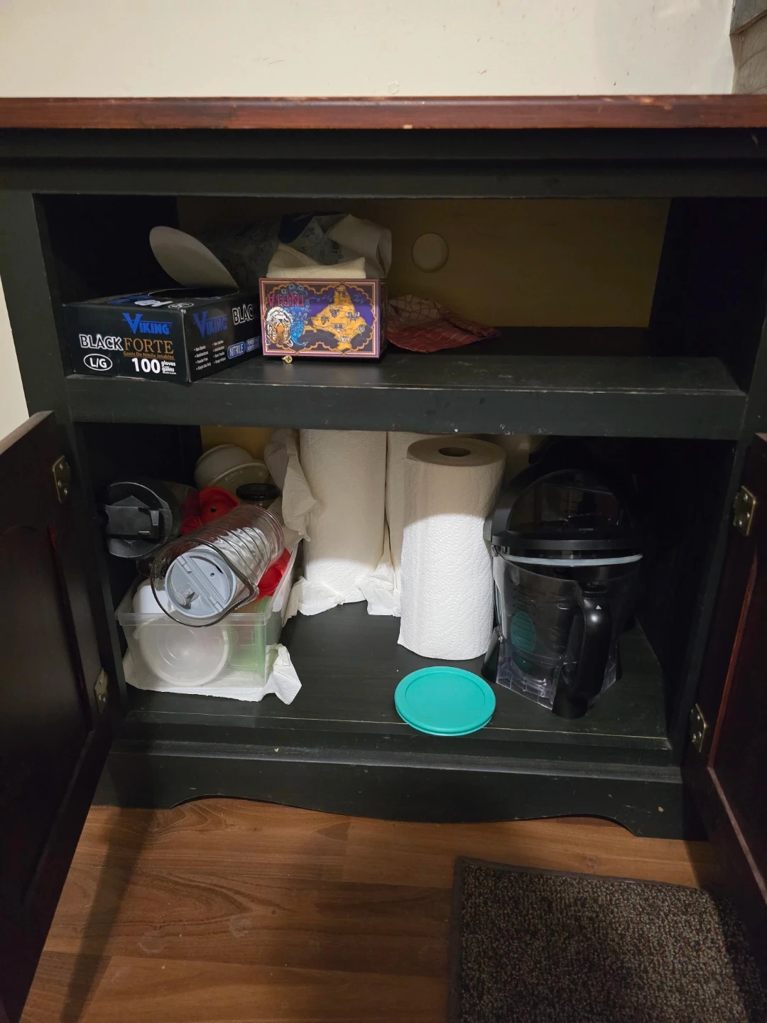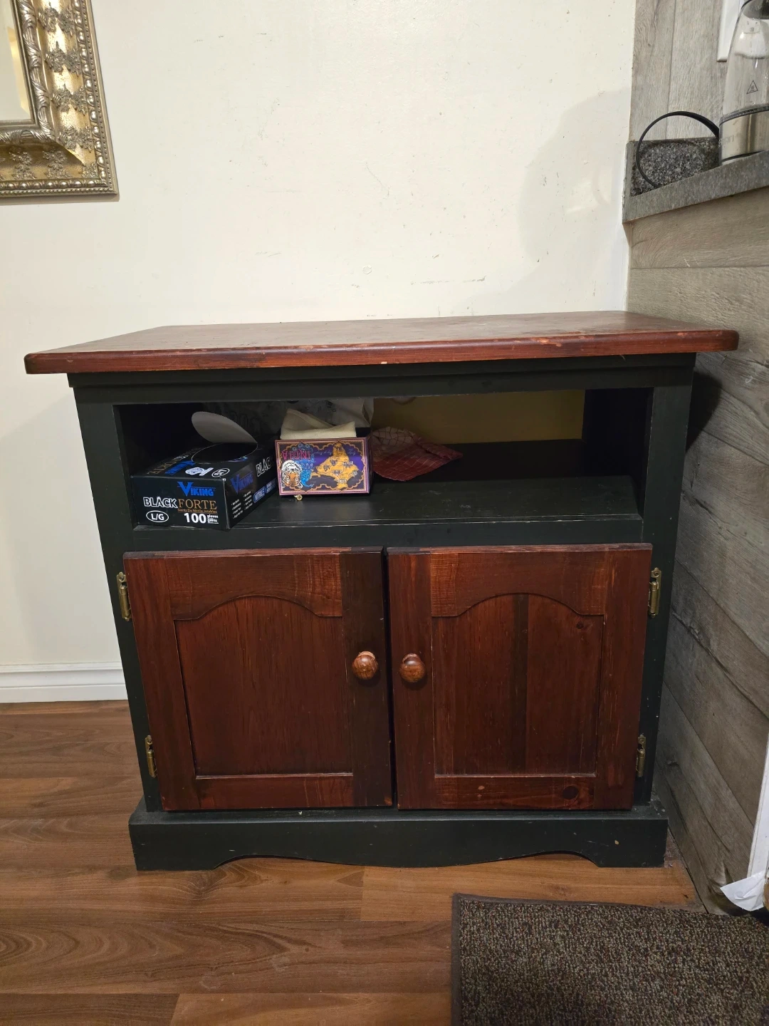 A dark wood storage cabinet with two doors. It features adjustable shelves inside for versatile storage. The exterior is a dark brown with reddish-brown doors.