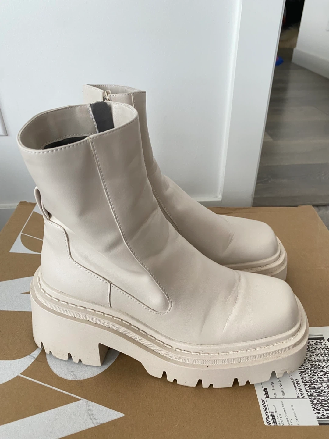 Cream coloured platform boots from ZARA. These have a lug sole and a side zipper closure. Size is 36.