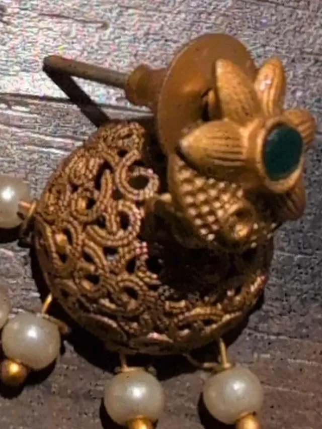 These earrings feature a gold-tone metal with intricate filigree work. They're adorned with faux pearls and a small green stone at the center. Perfect for adding a touch of elegance to your outfit!