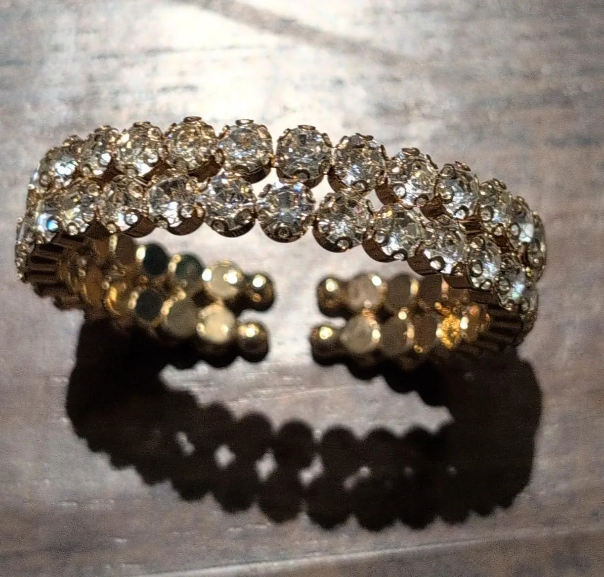 A sparkling gold-tone cuff bracelet with two rows of clear stones. This open cuff design is set with numerous clear, faceted stones. It's adjustable for a comfortable fit. It has a textured gold-tone metal base.