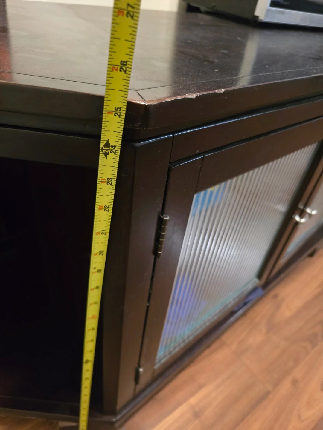 Dark wood corner TV stand featuring glass paneled doors and open shelving. It measures approximately 63 inches in width and 26 inches in height. This unit offers storage space behind its doors and an open compartment on the side.