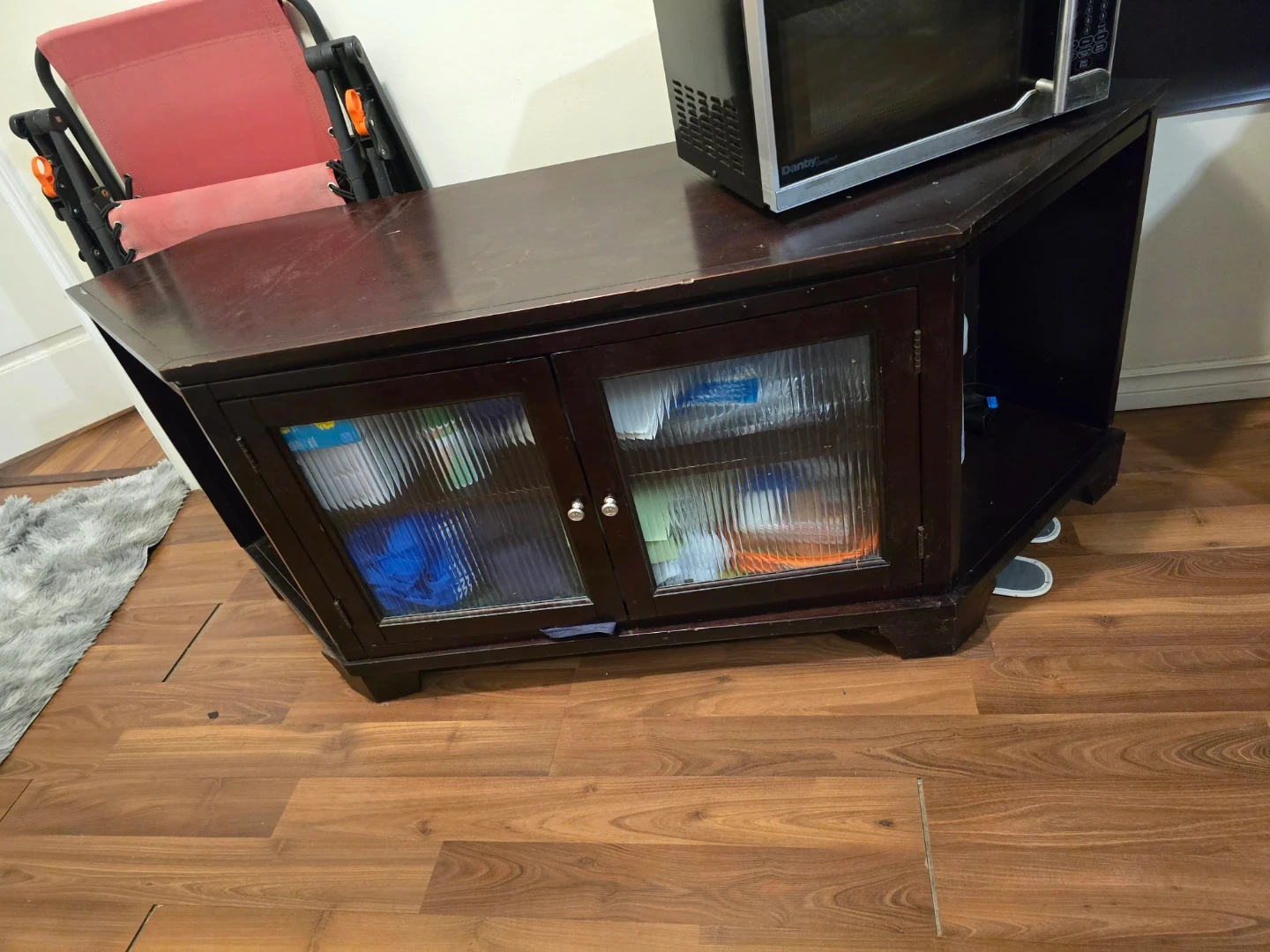 Dark Wood Corner TV Stand with Glass Doors