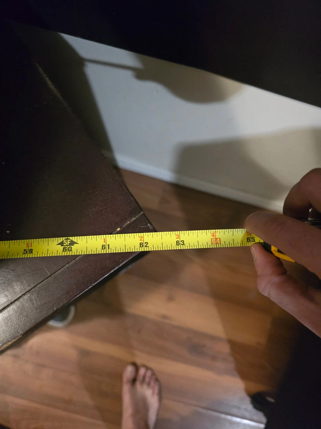 Dark wood corner TV stand featuring glass paneled doors and open shelving. It measures approximately 63 inches in width and 26 inches in height. This unit offers storage space behind its doors and an open compartment on the side.