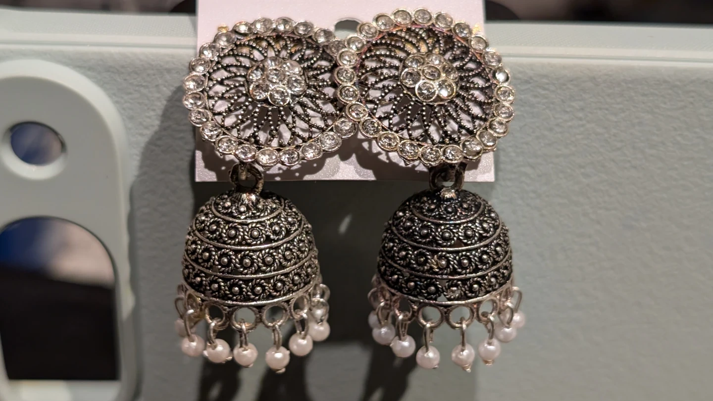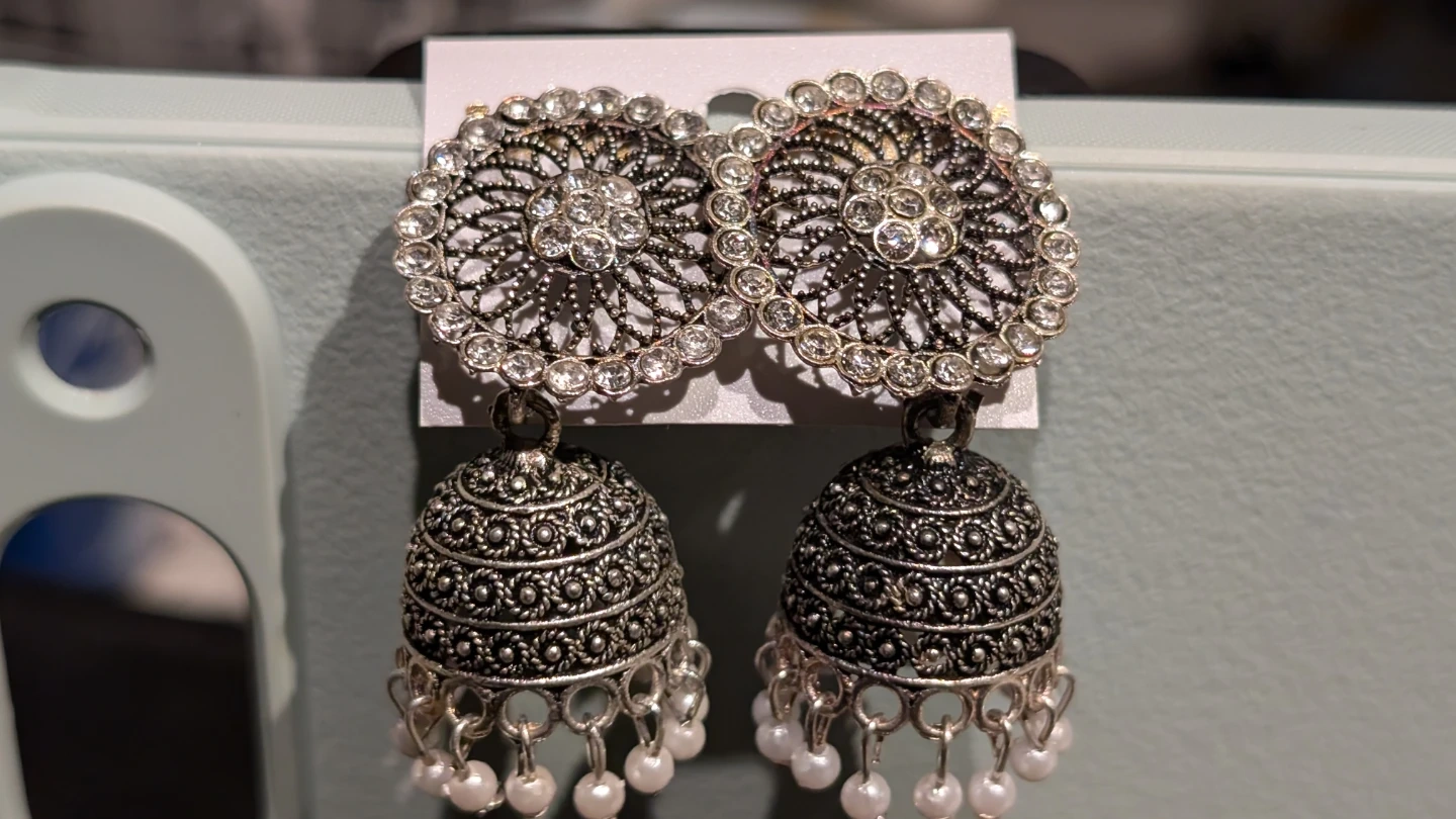 Silver-toned jhumka earrings. These earrings feature intricate detailing with a bell-shaped bottom. They're a traditional style that adds a cultural touch to an outfit.