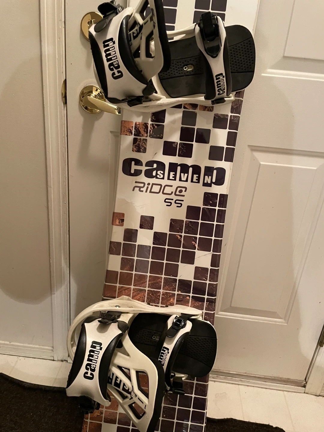 This is a Camp Seven "Ridge SS" snowboard with bindings. Bindings are adjustable and include straps for a secure fit.