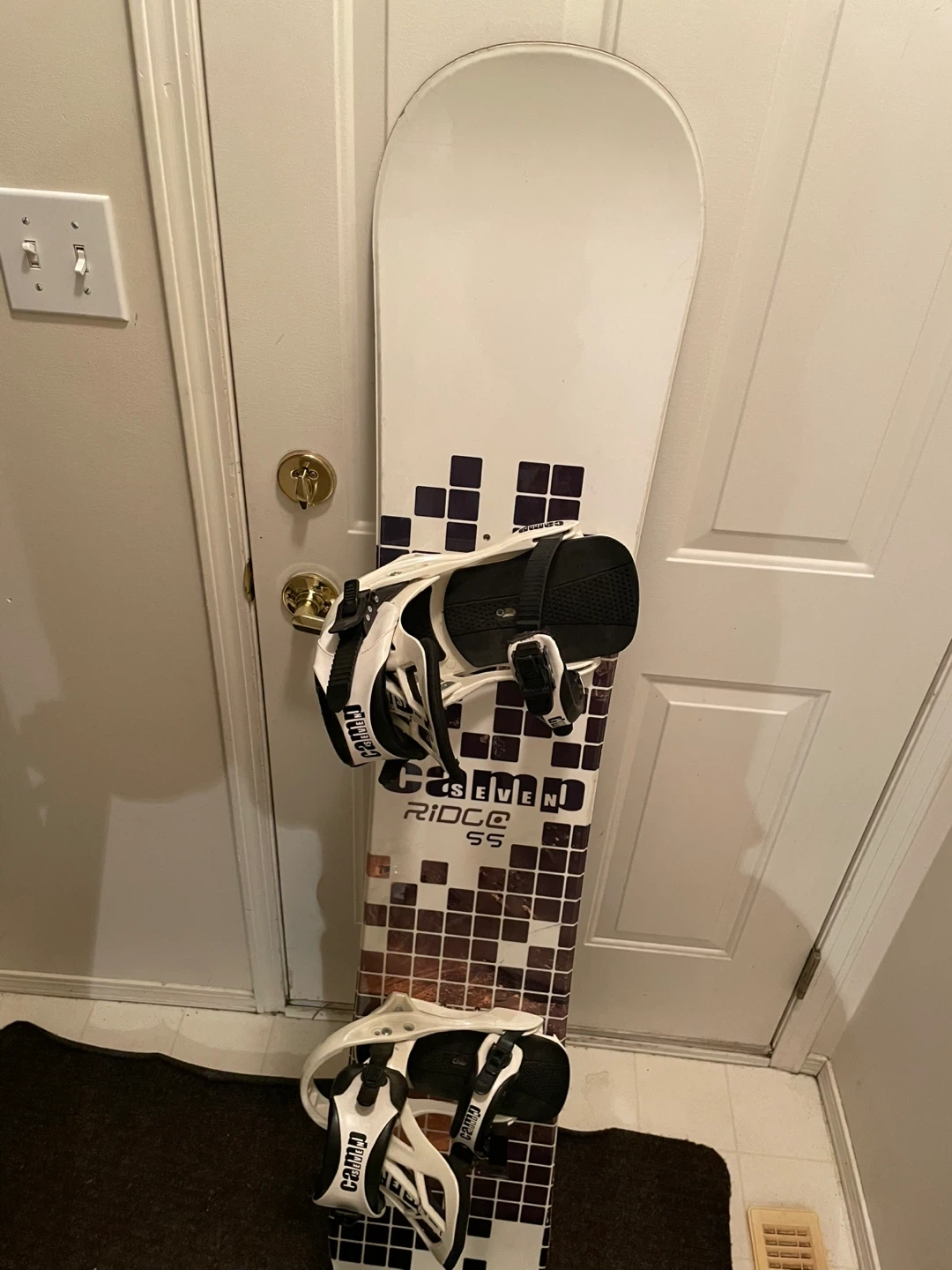 This is a Camp Seven "Ridge SS" snowboard with bindings. Bindings are adjustable and include straps for a secure fit.