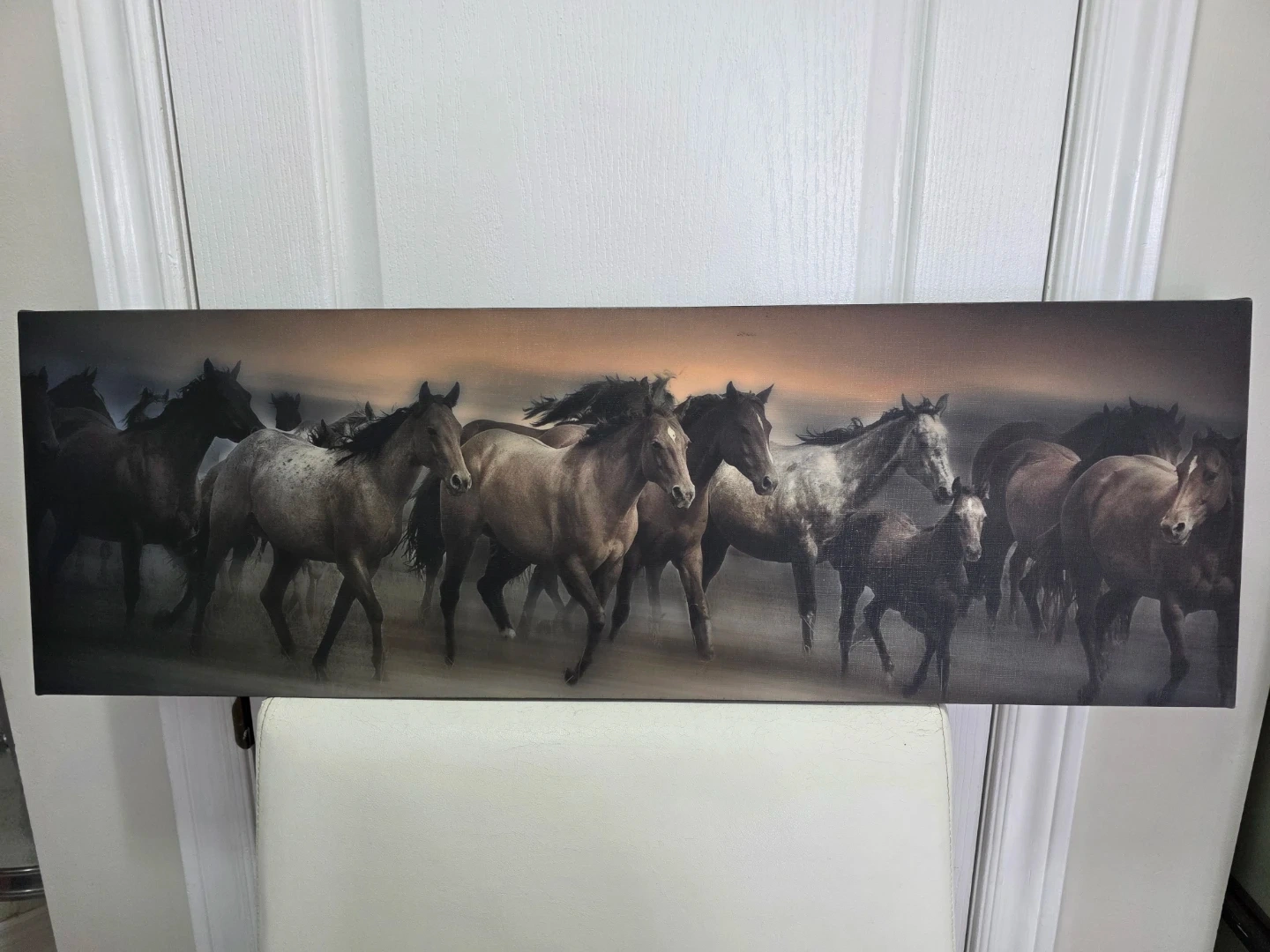 This canvas print features a herd of horses running. It's a landscape orientation piece. The canvas measures approximately 36 inches wide and 12 inches tall, with a depth of about 1.5 inches. It's ready to hang on your wall! Great for Chinese New Year of the Horse.