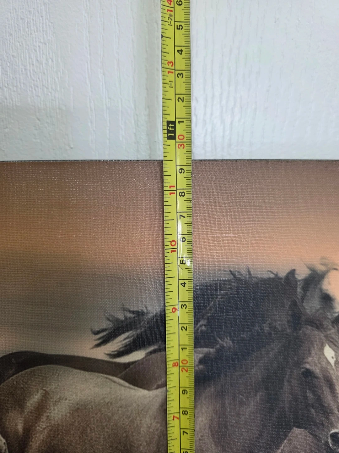 This canvas print features a herd of horses running. It's a landscape orientation piece. The canvas measures approximately 36 inches wide and 12 inches tall, with a depth of about 1.5 inches. It's ready to hang on your wall! Great for Chinese New Year of the Horse.