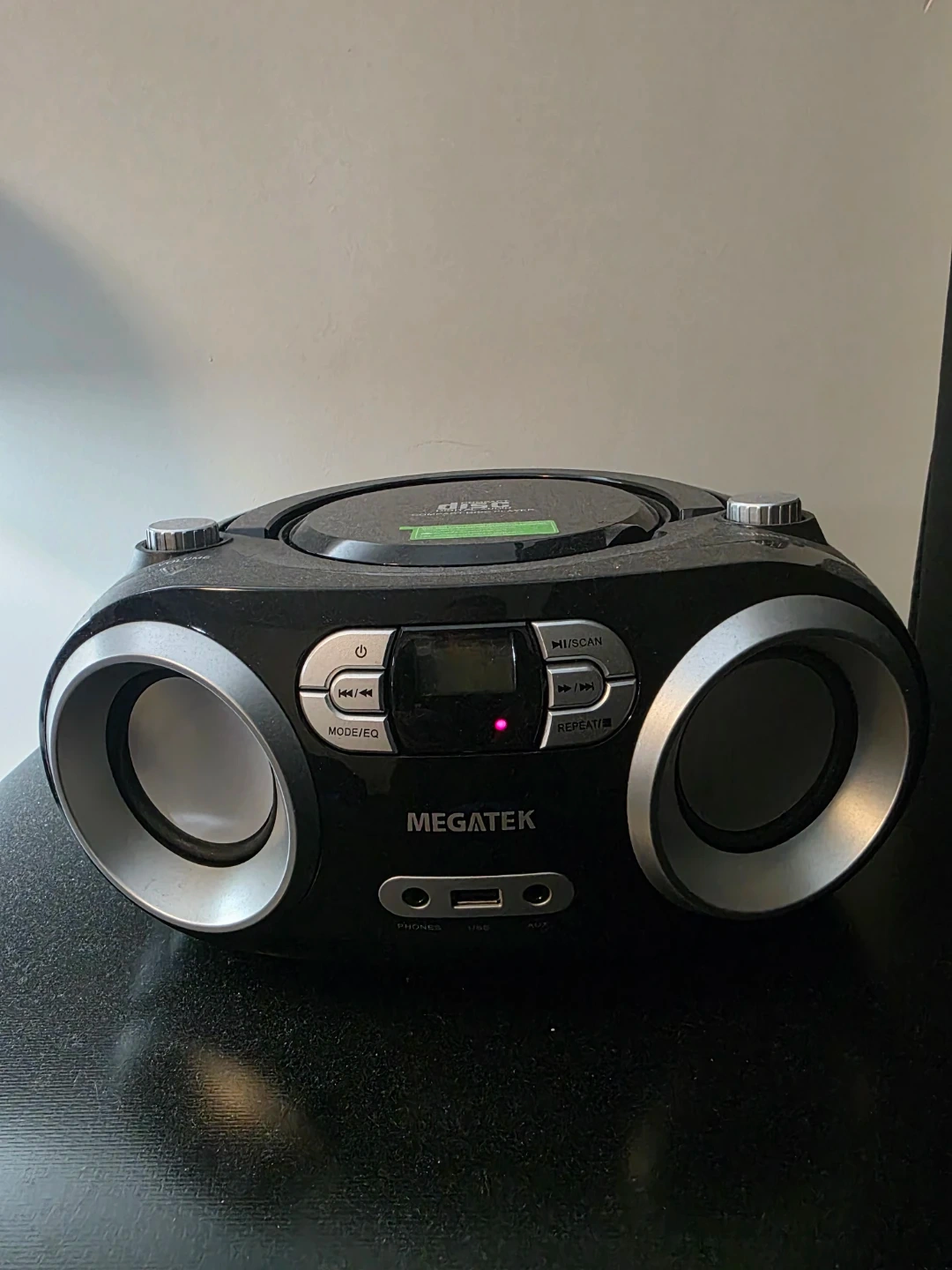 This is a MEGATEK CD boombox that also plays the radio and has a USB port. It's black with silver accents on the speakers. A great way to listen to your CDs or catch up on the radio!