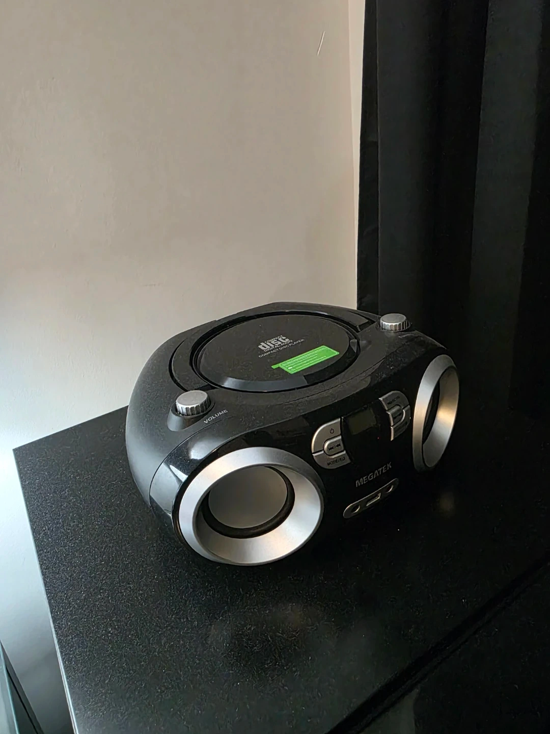 This is a MEGATEK CD boombox that also plays the radio and has a USB port. It's black with silver accents on the speakers. A great way to listen to your CDs or catch up on the radio!