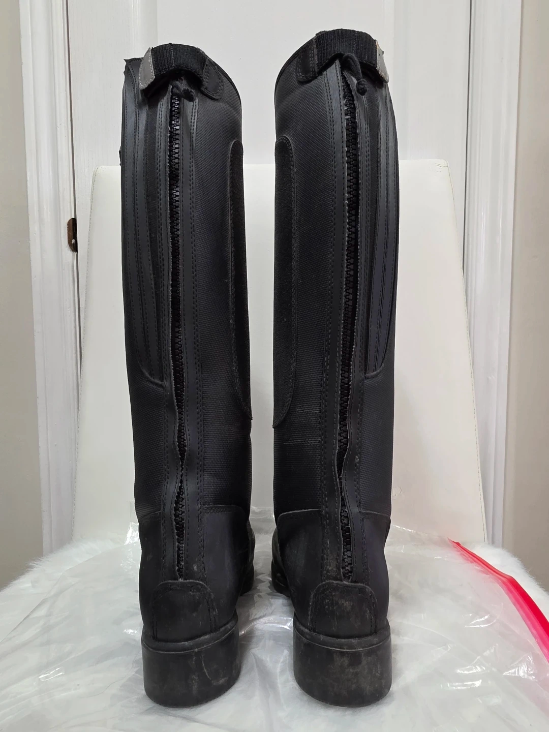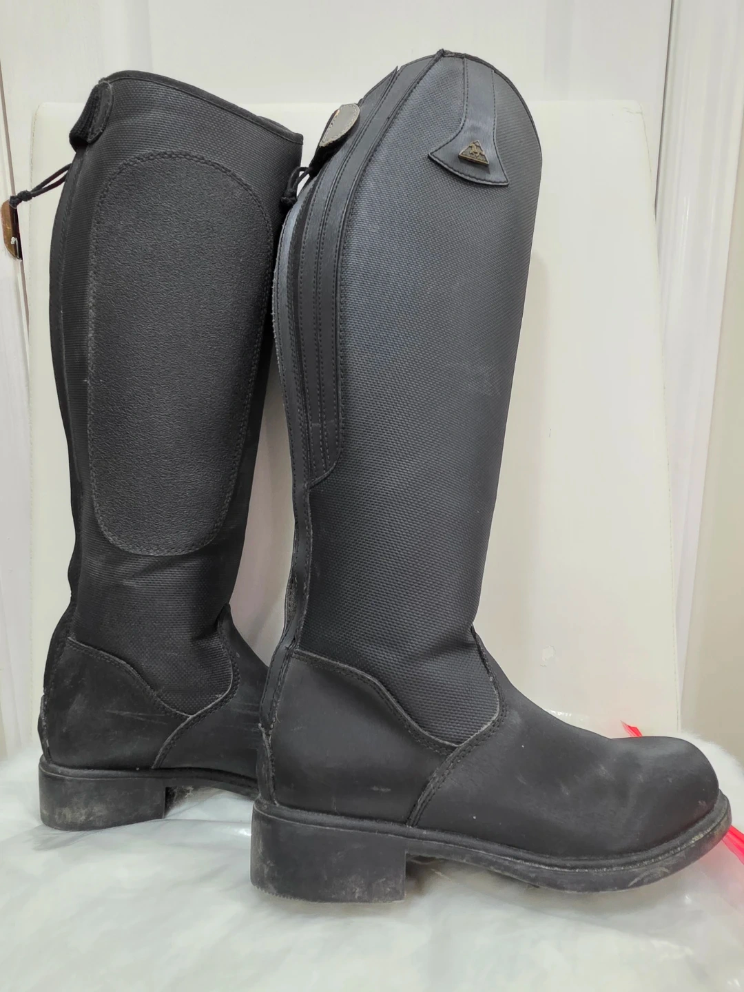 Mountain Horse tall black horse riding Thermolite winter boots. They feature a full-length zipper down the back for easy on and off. The boots have a sturdy sole for grip. Insulated. They're suitable for equestrian activities. Worn a few times, forgot I had another pair at the barn.