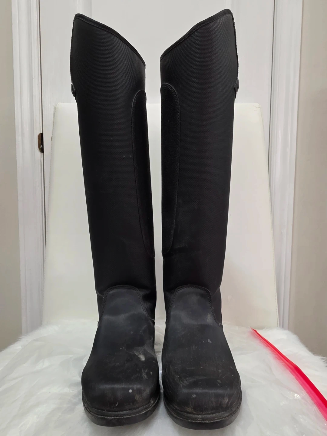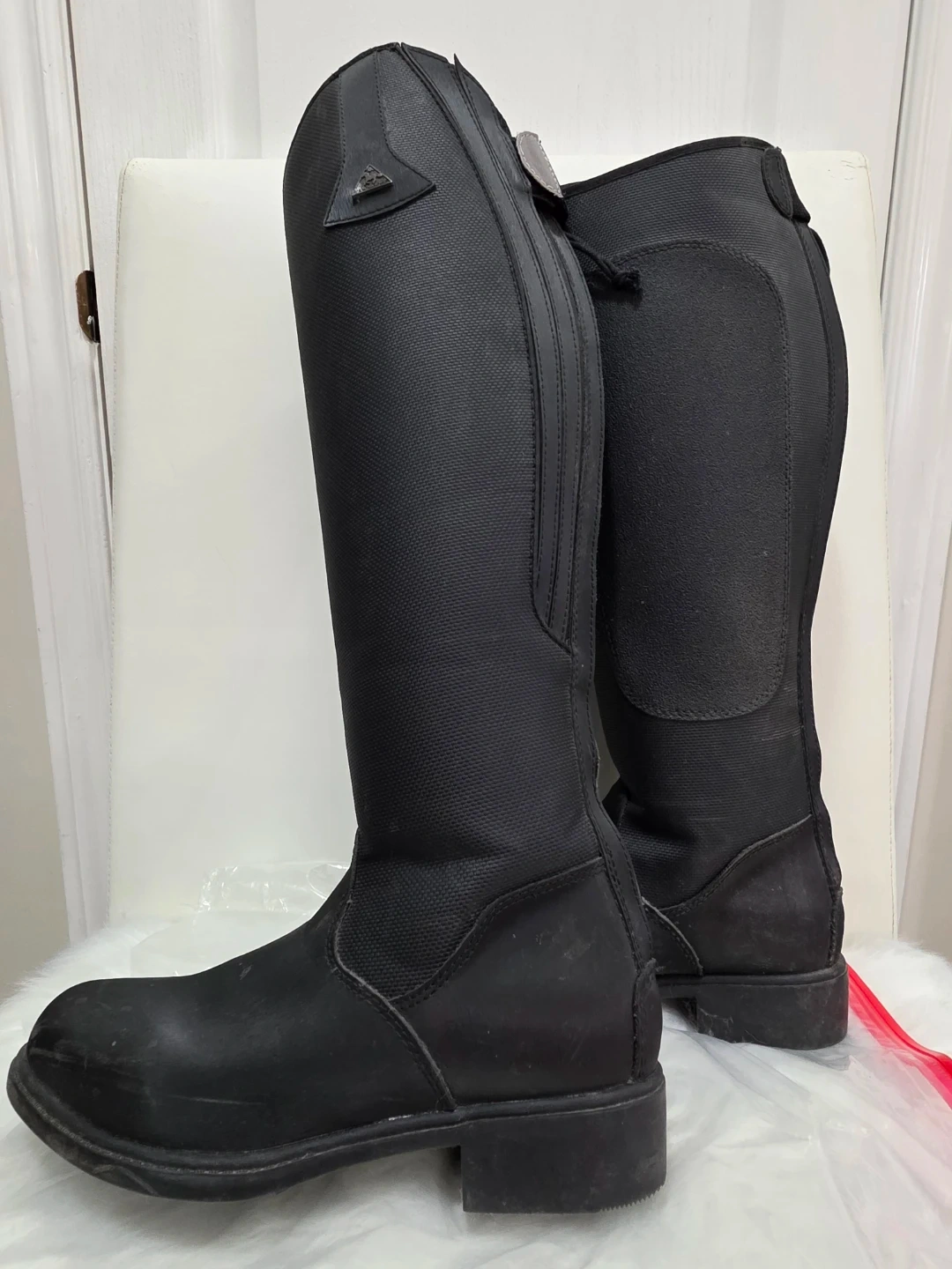 Mountain Horse tall black horse riding Thermolite winter boots. They feature a full-length zipper down the back for easy on and off. The boots have a sturdy sole for grip. Insulated. They're suitable for equestrian activities. Worn a few times, forgot I had another pair at the barn.