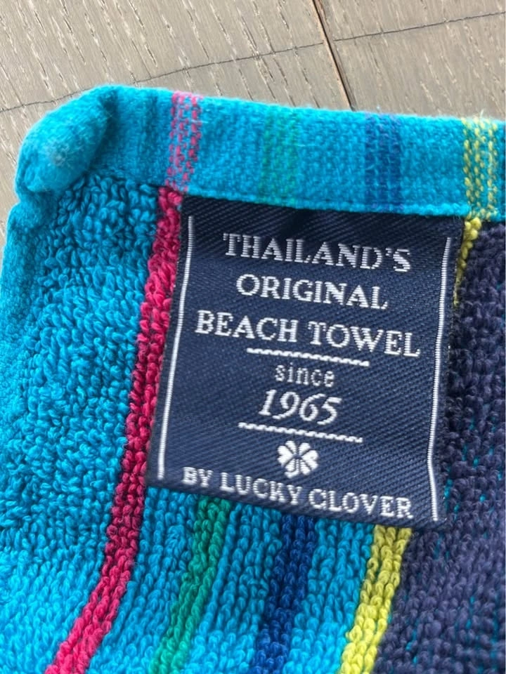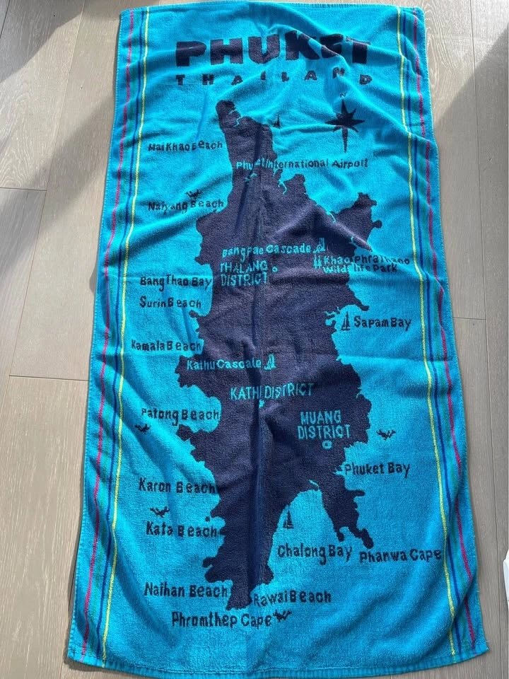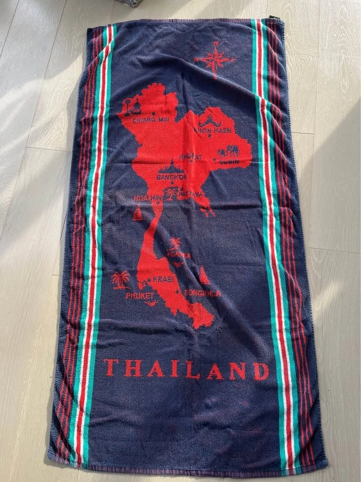 Two thin beach towels, one red and one blue, purchased in Thailand. They feature maps of Thailand and are made of 100% Cotton by Lucky Clover. Each towel is approximately 27" wide and 57" long. Let me know if you're interested!
