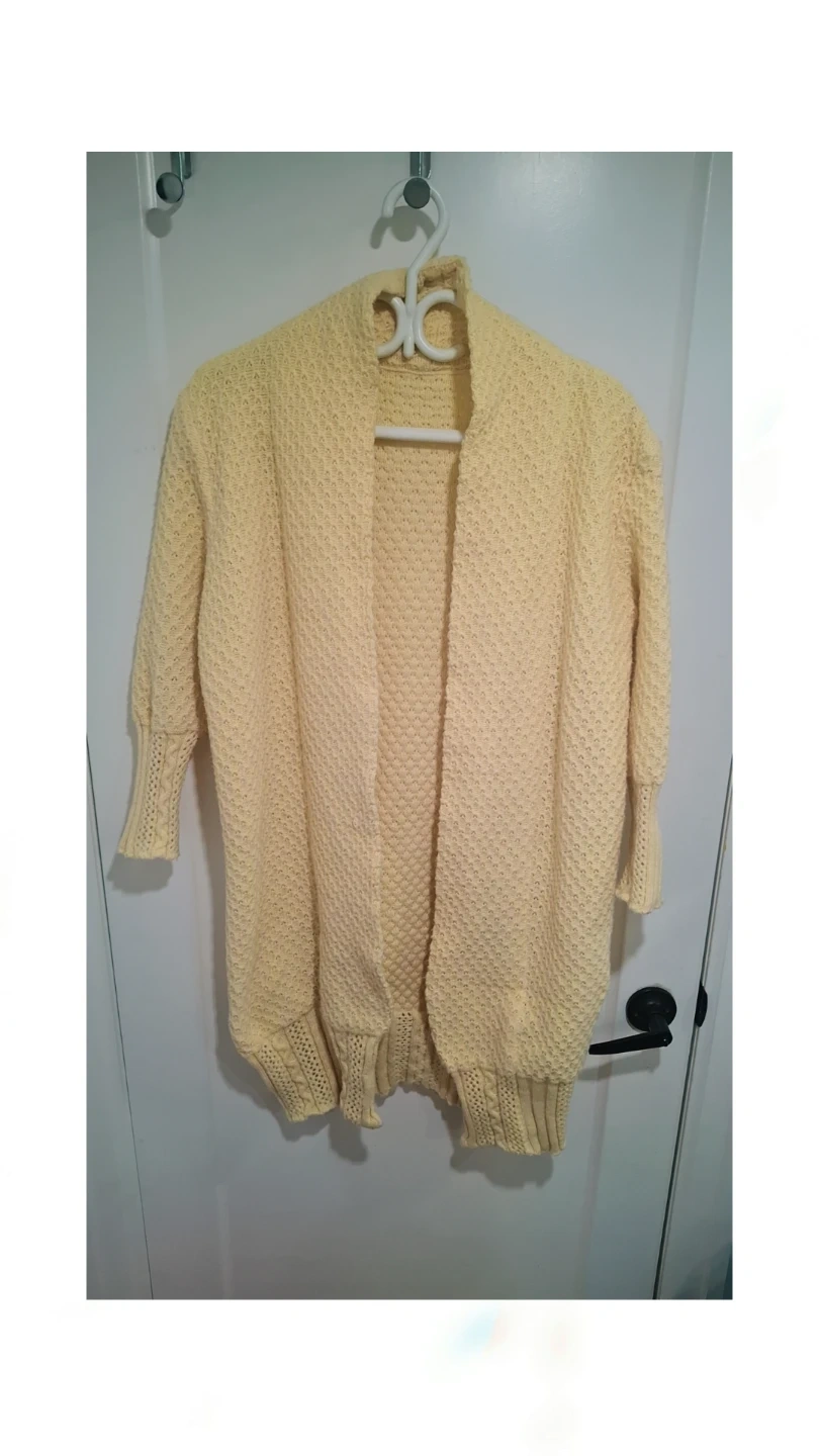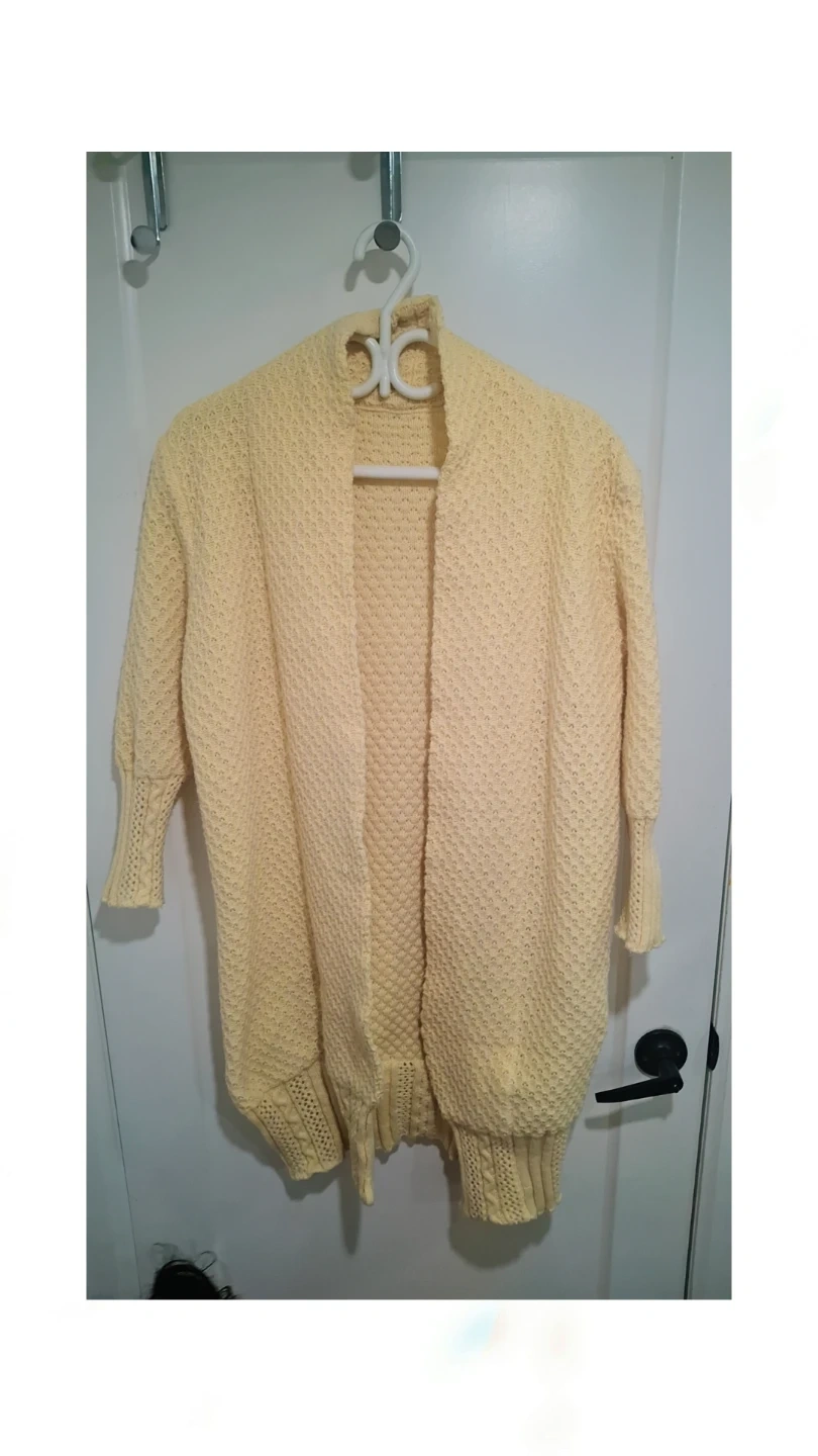 This is a pale yellow knit cardigan. It has a textured weave and dolman sleeves. It's a comfortable layering piece for cooler days.
