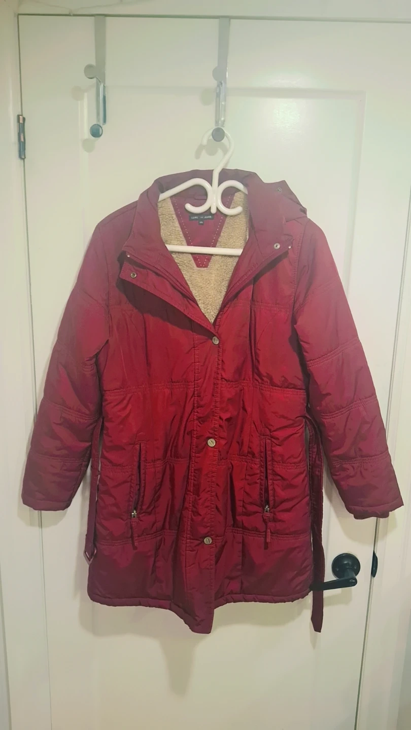 This maroon winter coat features a cozy sherpa lining and a tie belt. It's a great option for staying warm during colder months.