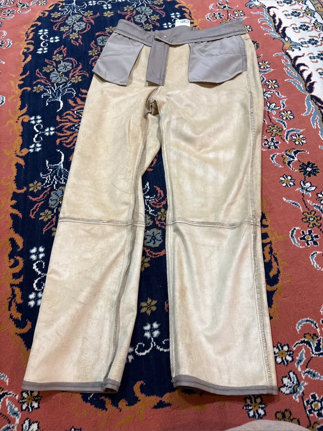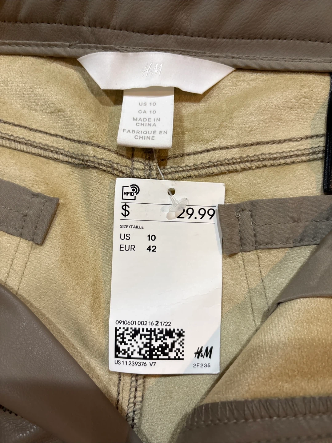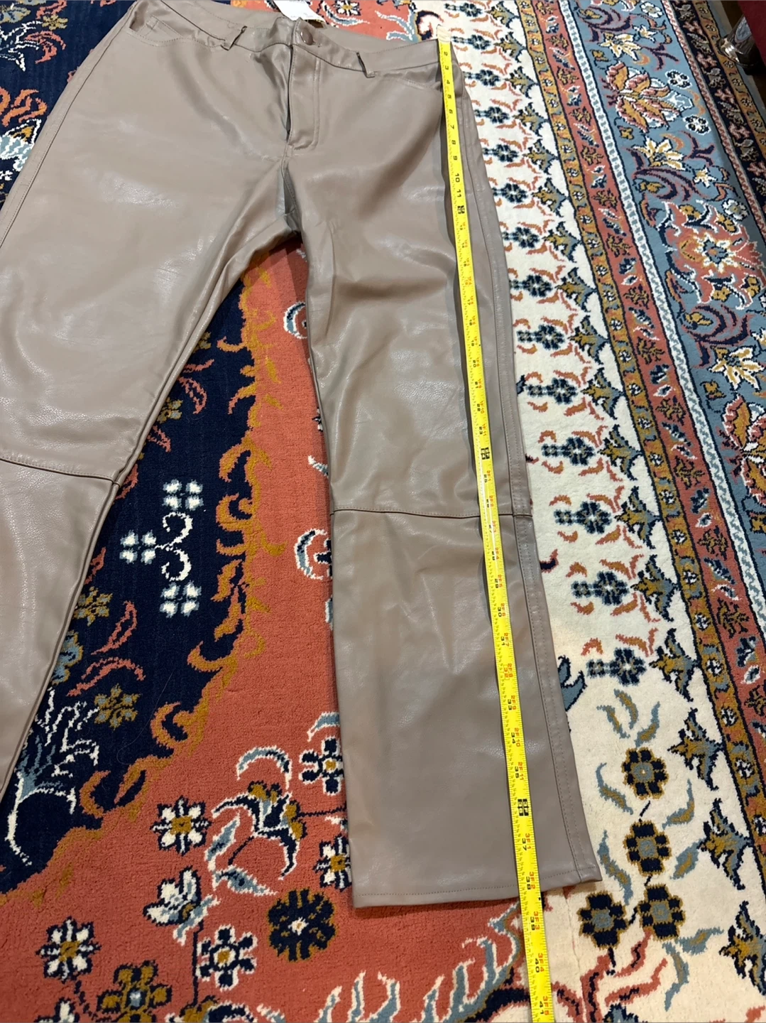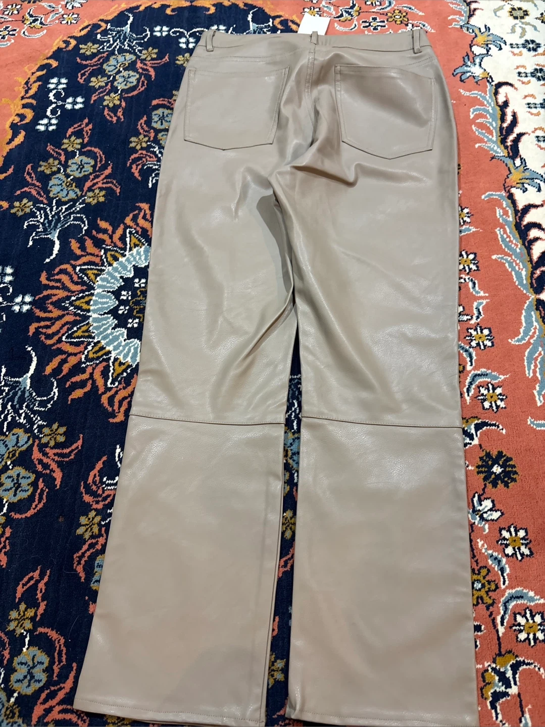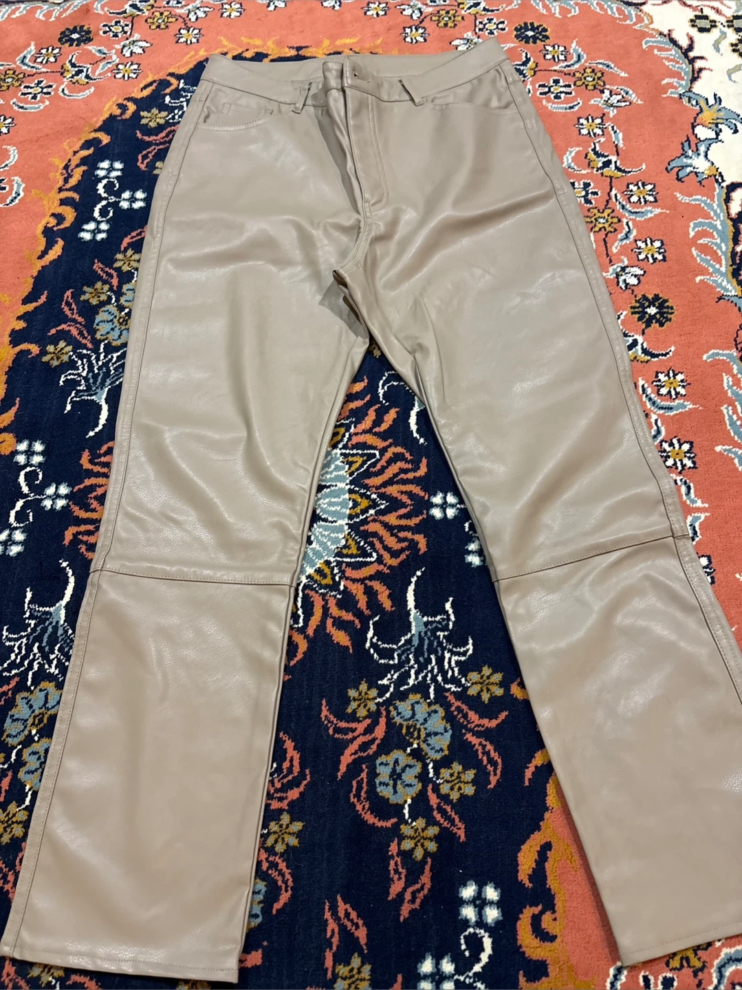 These are Beige faux leather Straight leg pants. The material is a faux leather. So Comfortable. They're a size 10.