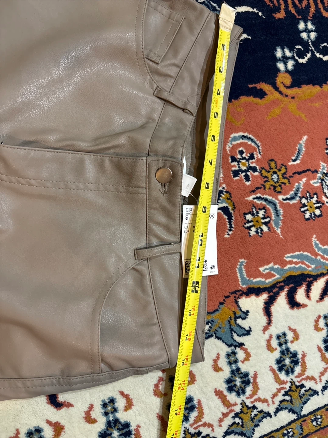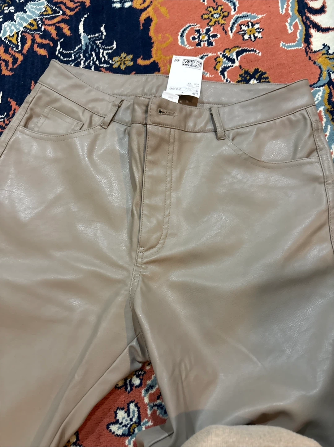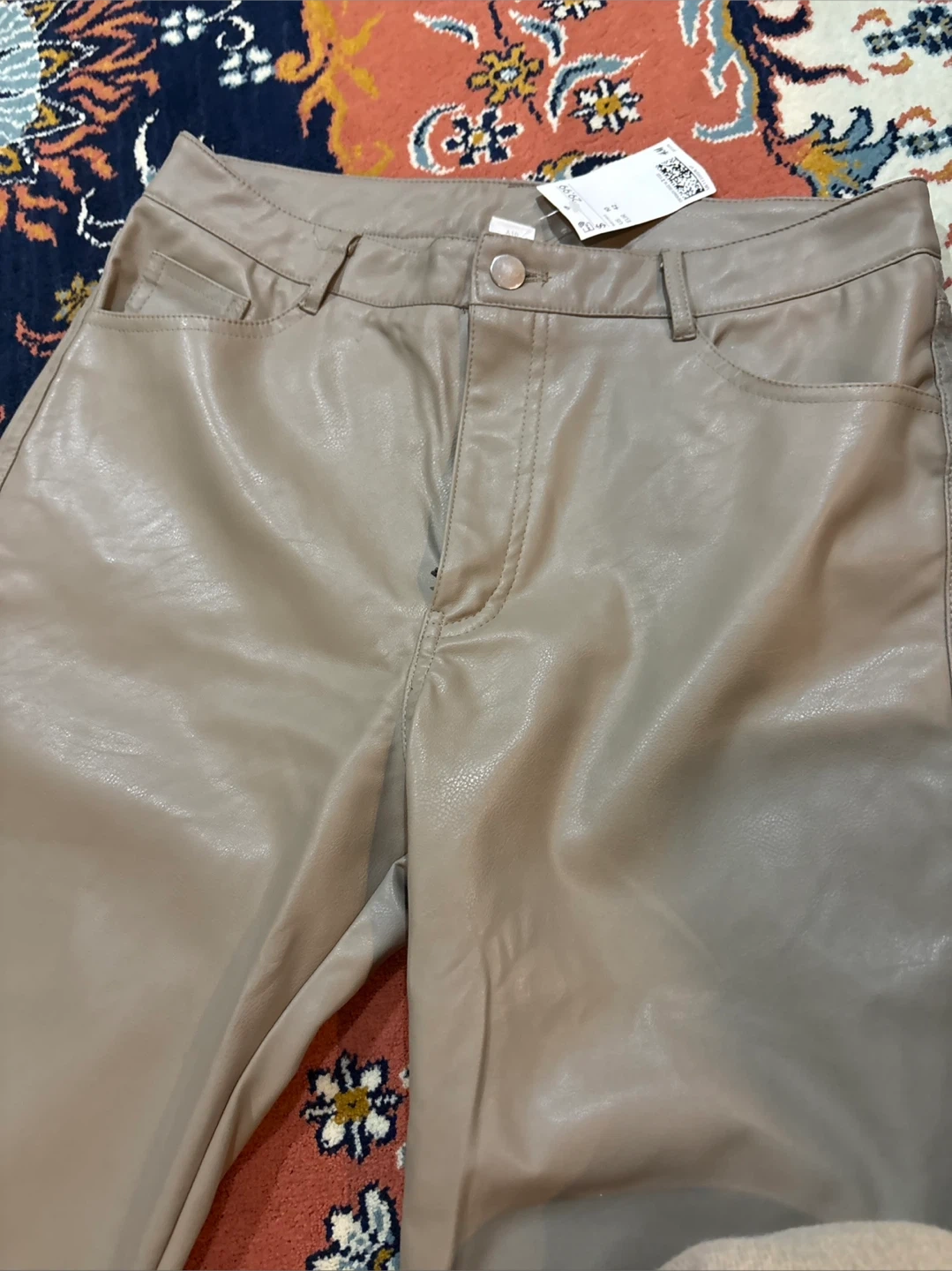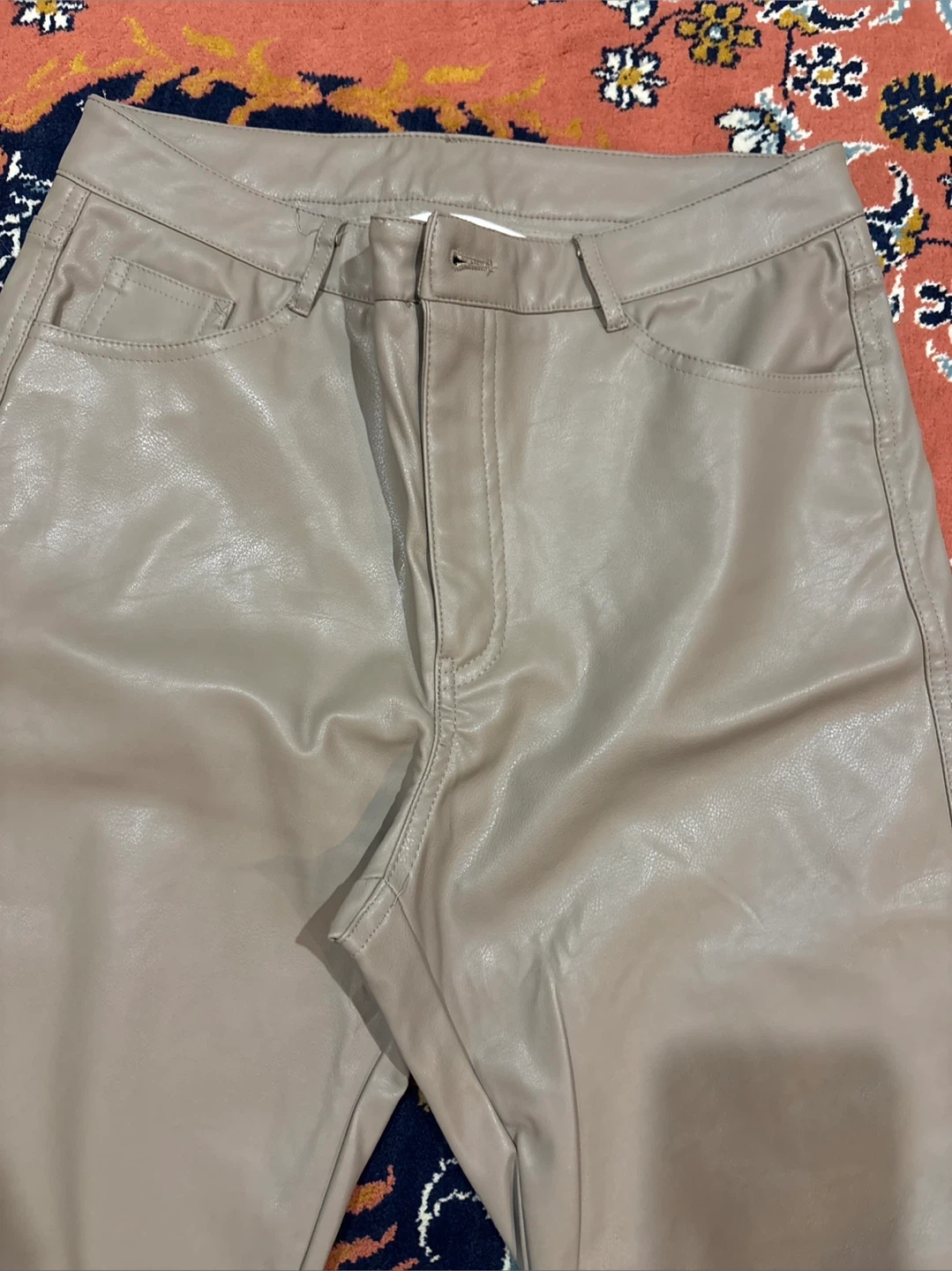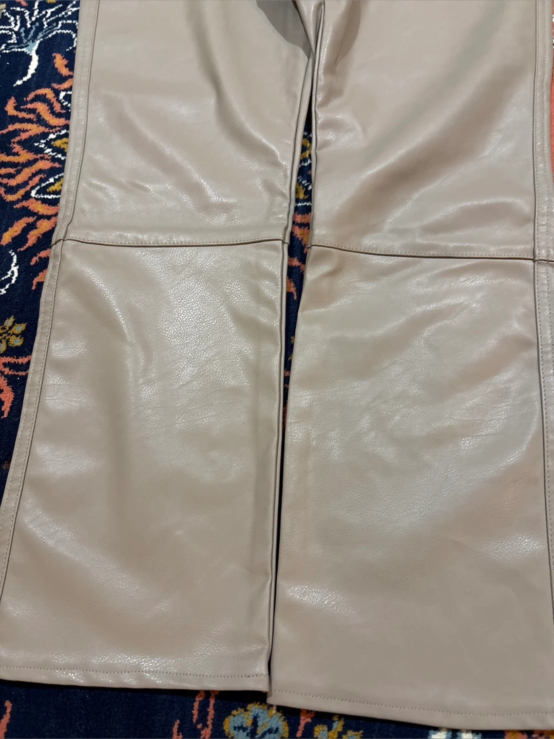 These are Beige faux leather Straight leg pants. The material is a faux leather. So Comfortable. They're a size 10.