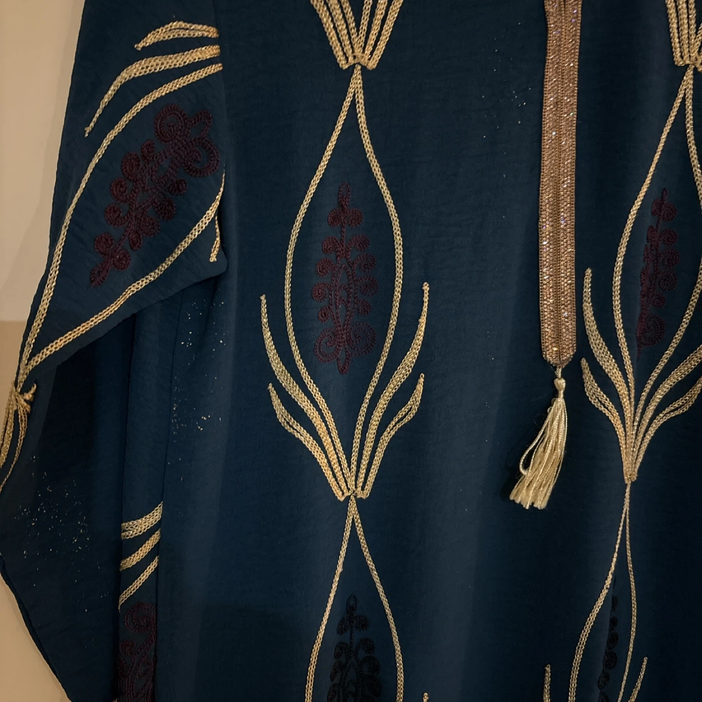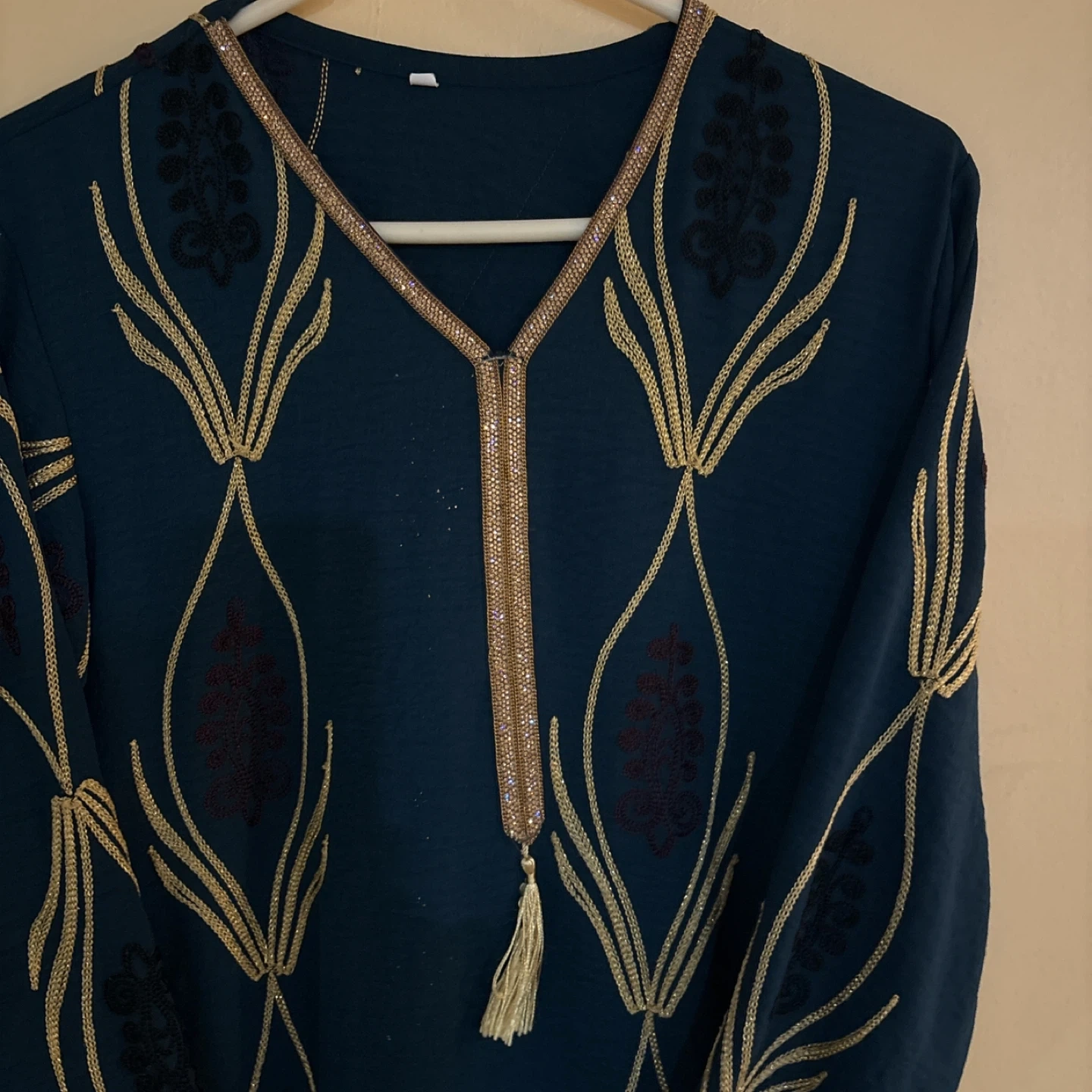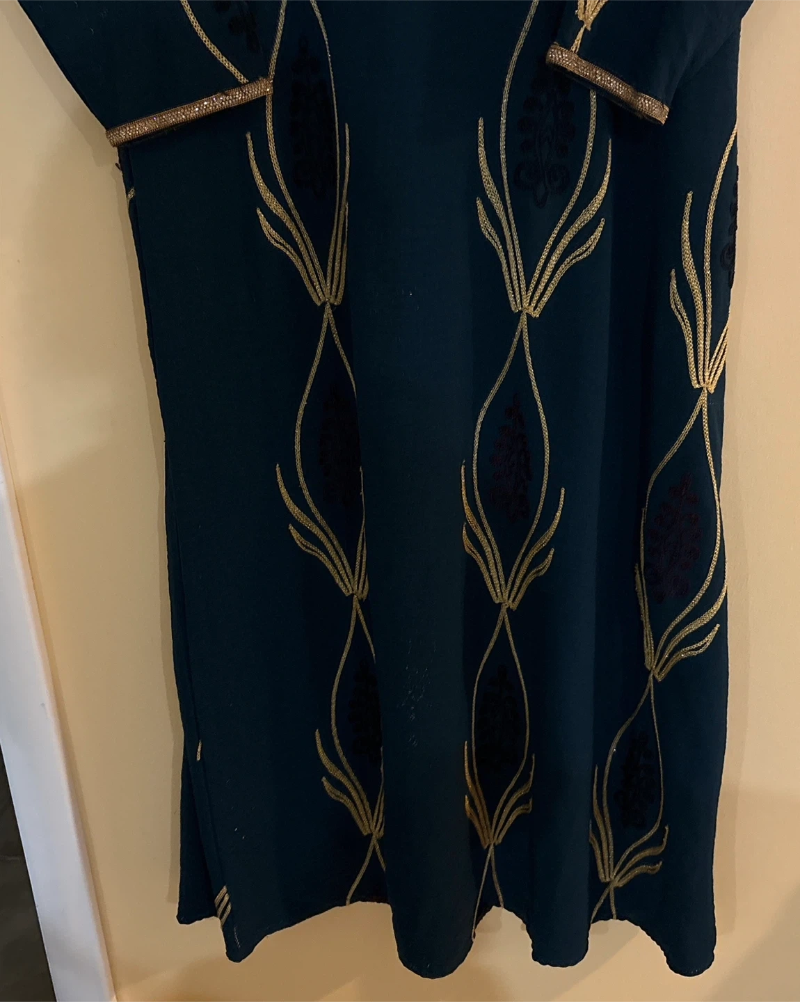 A beautiful teal dress featuring intricate gold embroidery and trim. It has a V-neckline with a decorative tassel and long sleeves. This dress is perfect for special occasions!