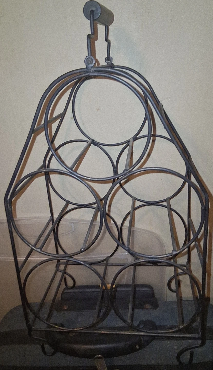 This metal wine rack holds multiple bottles. It's made of dark metal and has a unique shape. It's useful for storing wine bottles in a kitchen or cellar. Pick up only unless near intersection of Oxford and Gammage Street..