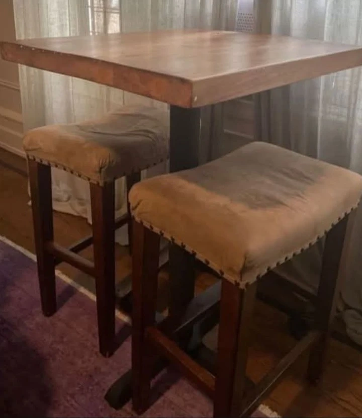 This is a square top bar table with two upholstered stools. The stools have wooden legs and are studded around the seat. The table has a real wood top and a metal base. This set is perfect for a small kitchen or dining area. Reduced to $40 or your best offer. Need it gone ASAP so open to offers. 20 for the table and 20 for both stools. Has some blemishes from transporting but sturdy & strong AS IS
