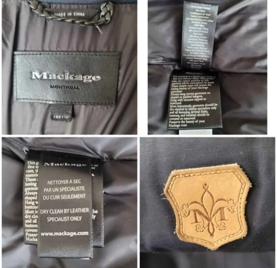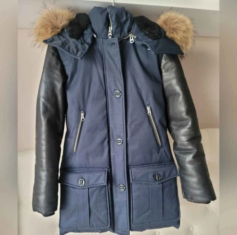 Great condition, great quality Mackage Montreal Jacket. Very warm and heavy duty. This jacket is in really great used condition. Interior lining excellent. Collar has minor wear. Hood and overall exterior zippers buttons, wrist cuffs, bottom hem excellent. Some wear to leather sleeve where it rubs against jacket. Pick up in Scarborough, Kennedy and 401. Occasionally downtown Toronto, Queen and Victoria on days I work there. Features: Leather Sleeves in black, so many pockets, zippered and button flap, detachable hood and detachable fur, plush lined hood, quality YKK wide zips in brushed silver colour. Tagged as XXS. Approximate measurements in inches: PTP 17, Length 30, Sleeve 23, Waist narrowest 16, Shoulder to shoulder 16. Material: Exterior 61% Cotton, 39% Nylon. Lining 100% Nylon. Filling 80% Duck down, 20% Feather. Hood - real natural fur - Racoon. Fur origin China. Genuine sheepskin dyed: 45% Wool, 45% Acrylic, 10% Spandez.
