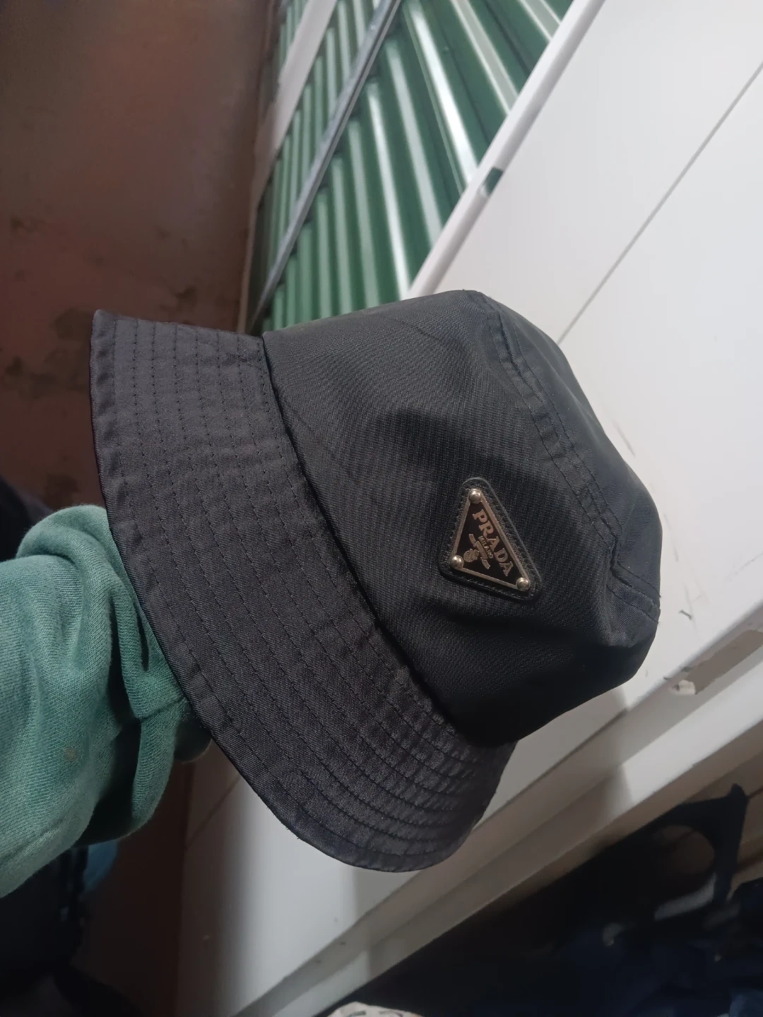 This is a black cotton bucket hat from PRADA - MILANO. Made in Italy, it features the iconic PRADA logo triangle emblem on the front. It's a stylish accessory for everyday wear.