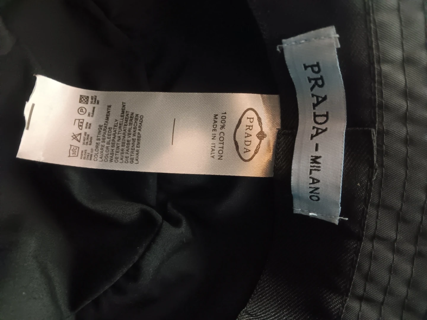 This is a black cotton bucket hat from PRADA - MILANO. Made in Italy, it features the iconic PRADA logo triangle emblem on the front. It's a stylish accessory for everyday wear.