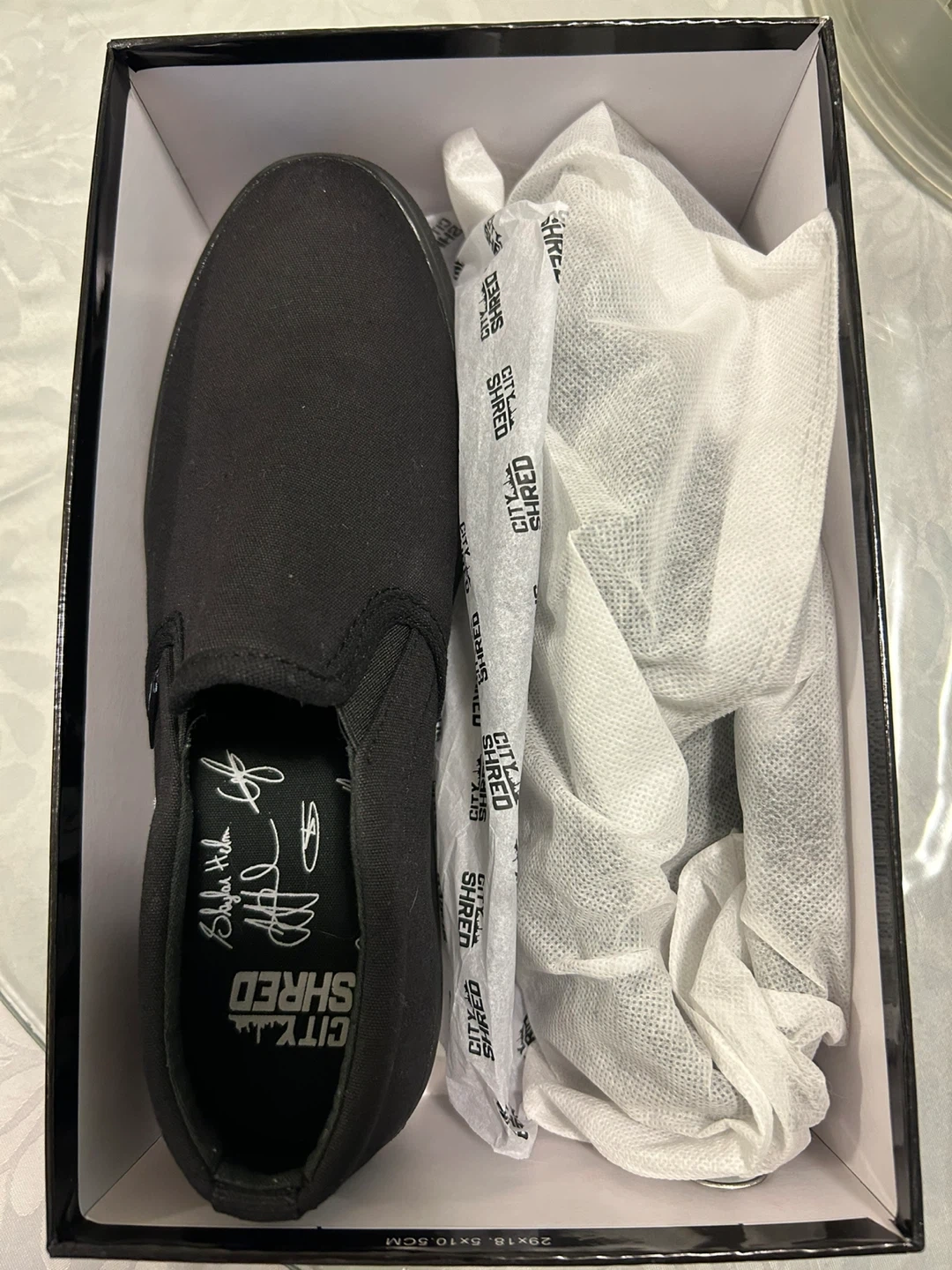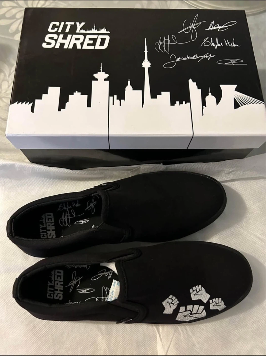 These black slip-on shoes are from City Shred. They feature a cityscape design on the box and are signed by multiple individuals. The shoes also have a fist graphic on the side.