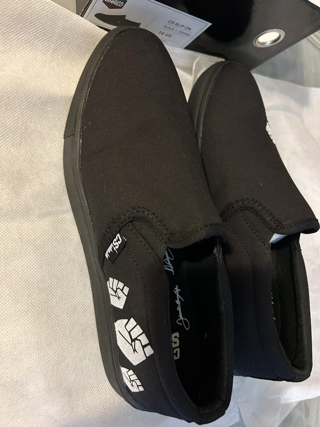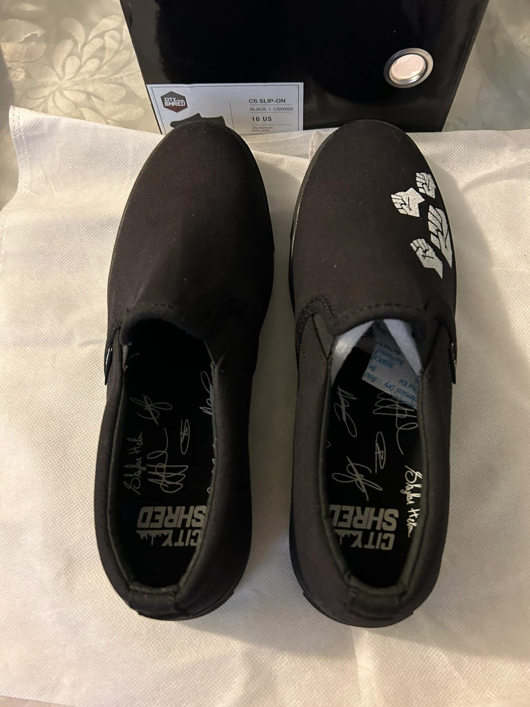 These black slip-on shoes are from City Shred. They feature a cityscape design on the box and are signed by multiple individuals. The shoes also have a fist graphic on the side.