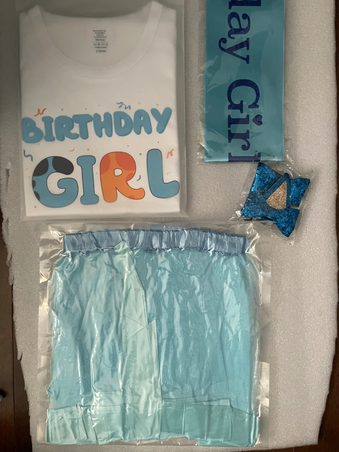 This cute outfit is perfect for a little one's second birthday celebration. It includes a "I'm Two Cute" t-shirt, a sparkly blue tutu, and a "Birthday Girl" sash. The t-shirt is white with blue and orange lettering, and the tutu has a matching blue bow. It's a fun set to make her special day even more memorable!