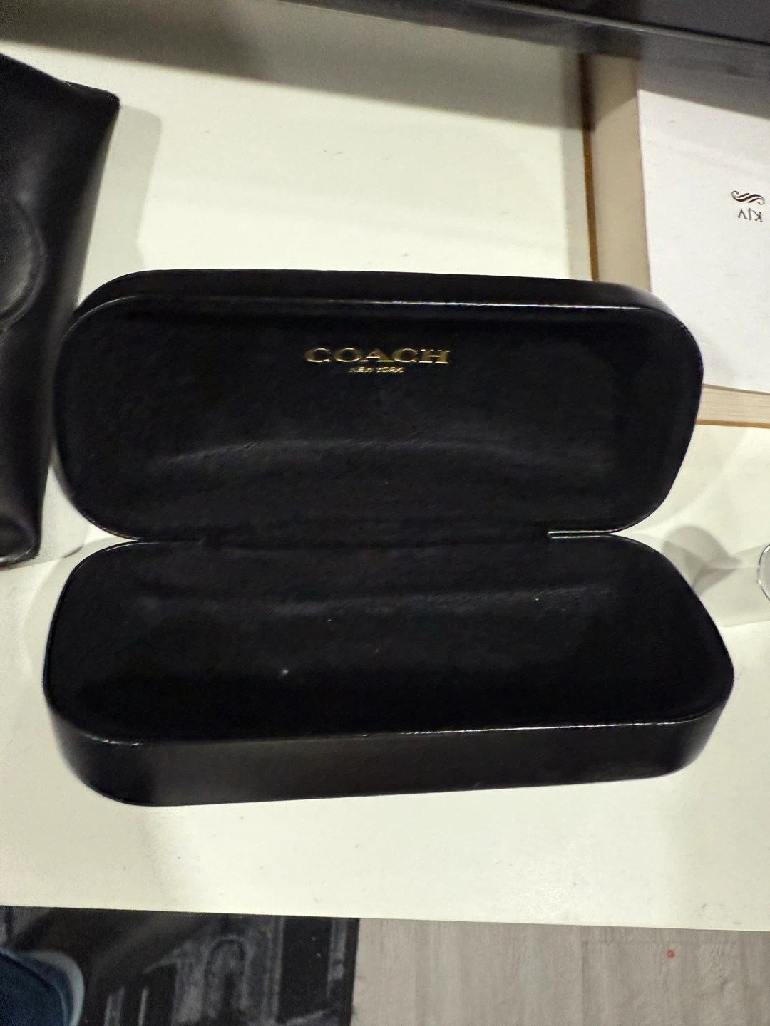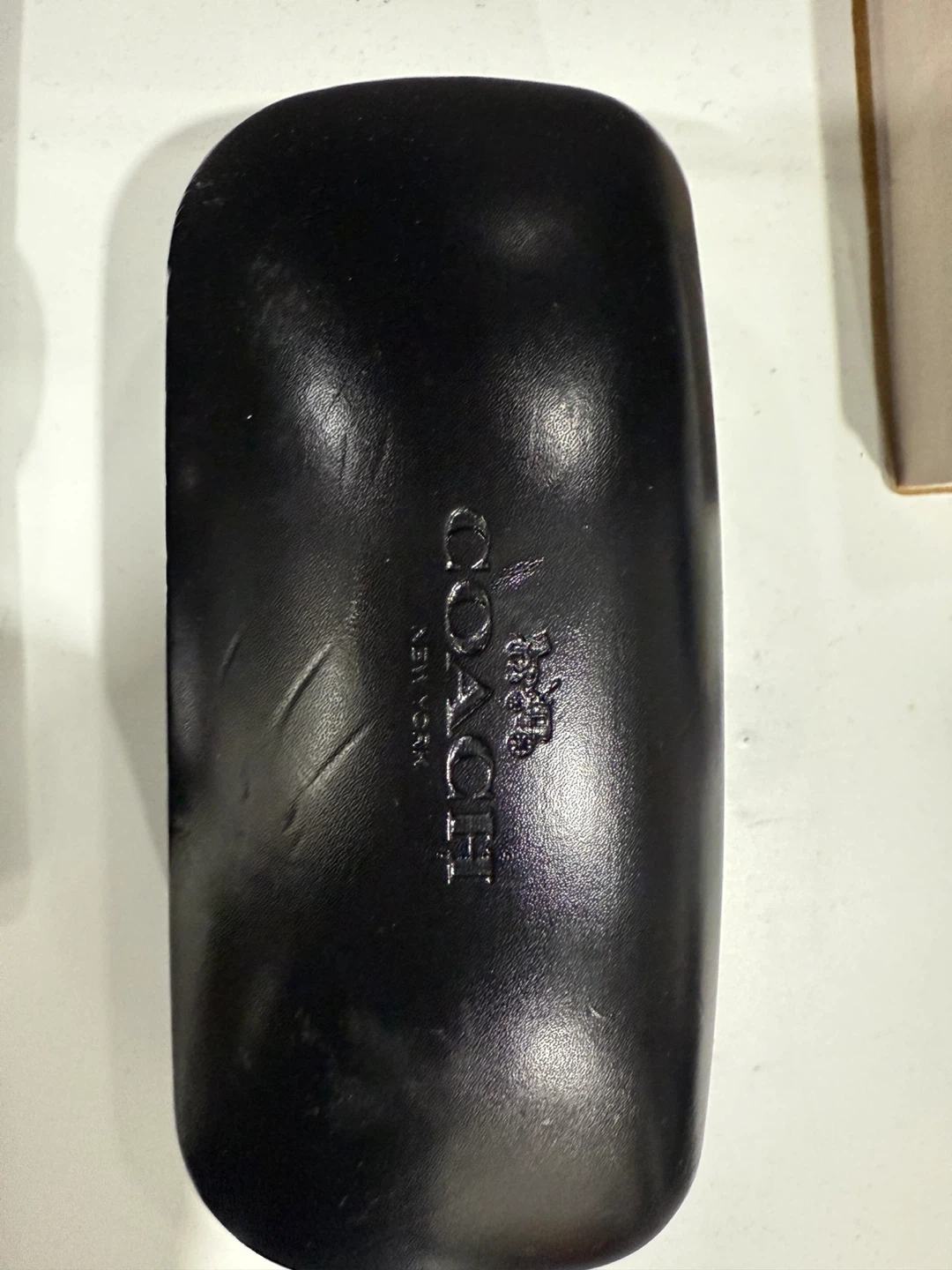 This is a black hard shell eyeglass case from Coach. It features the Coach New York logo embossed on the exterior and interior. It's a great way to keep your glasses safe!