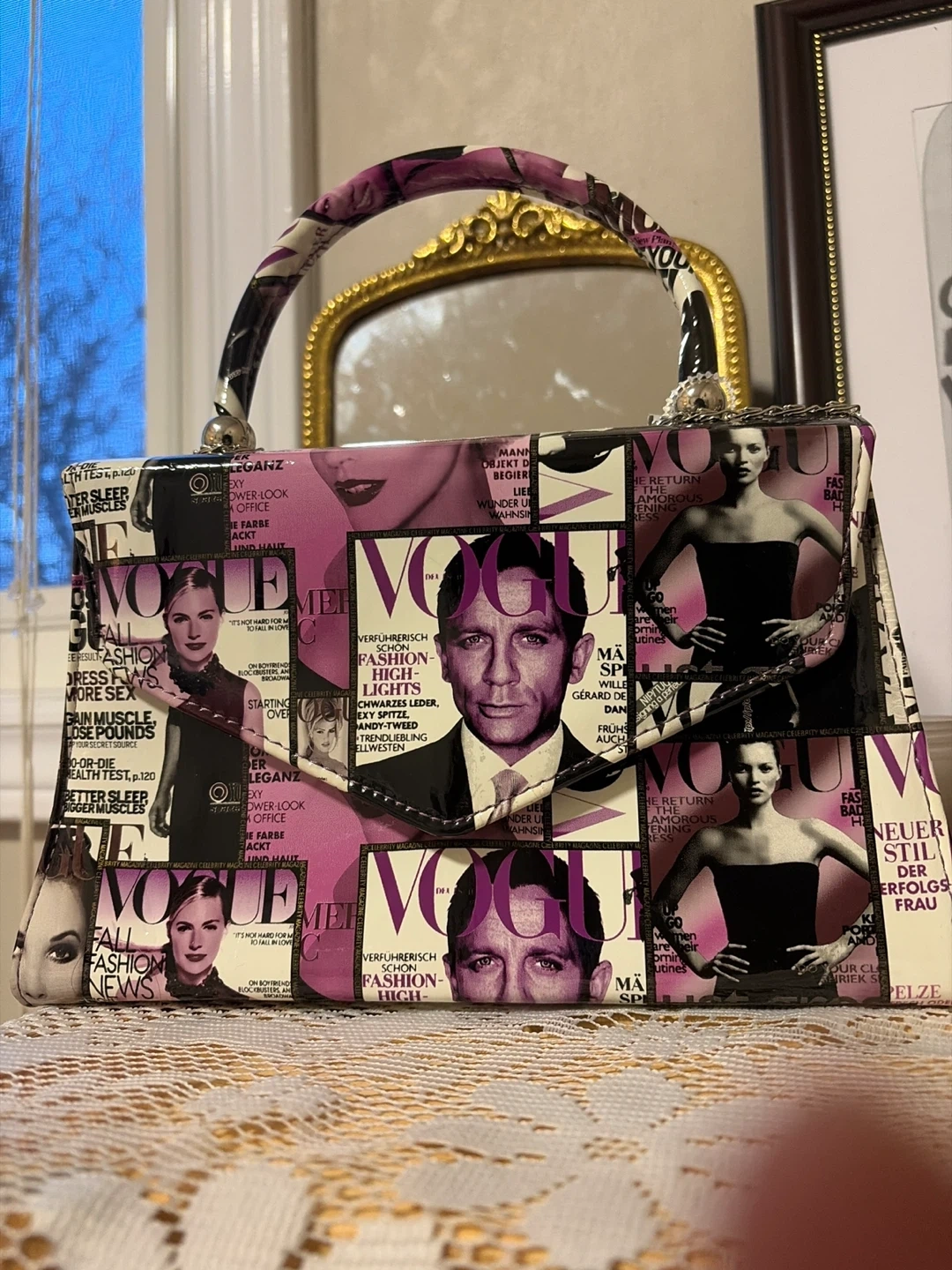This unique handbag features a vibrant print inspired by classic Vogue magazine covers. It's a stylish accessory with a retro flair.