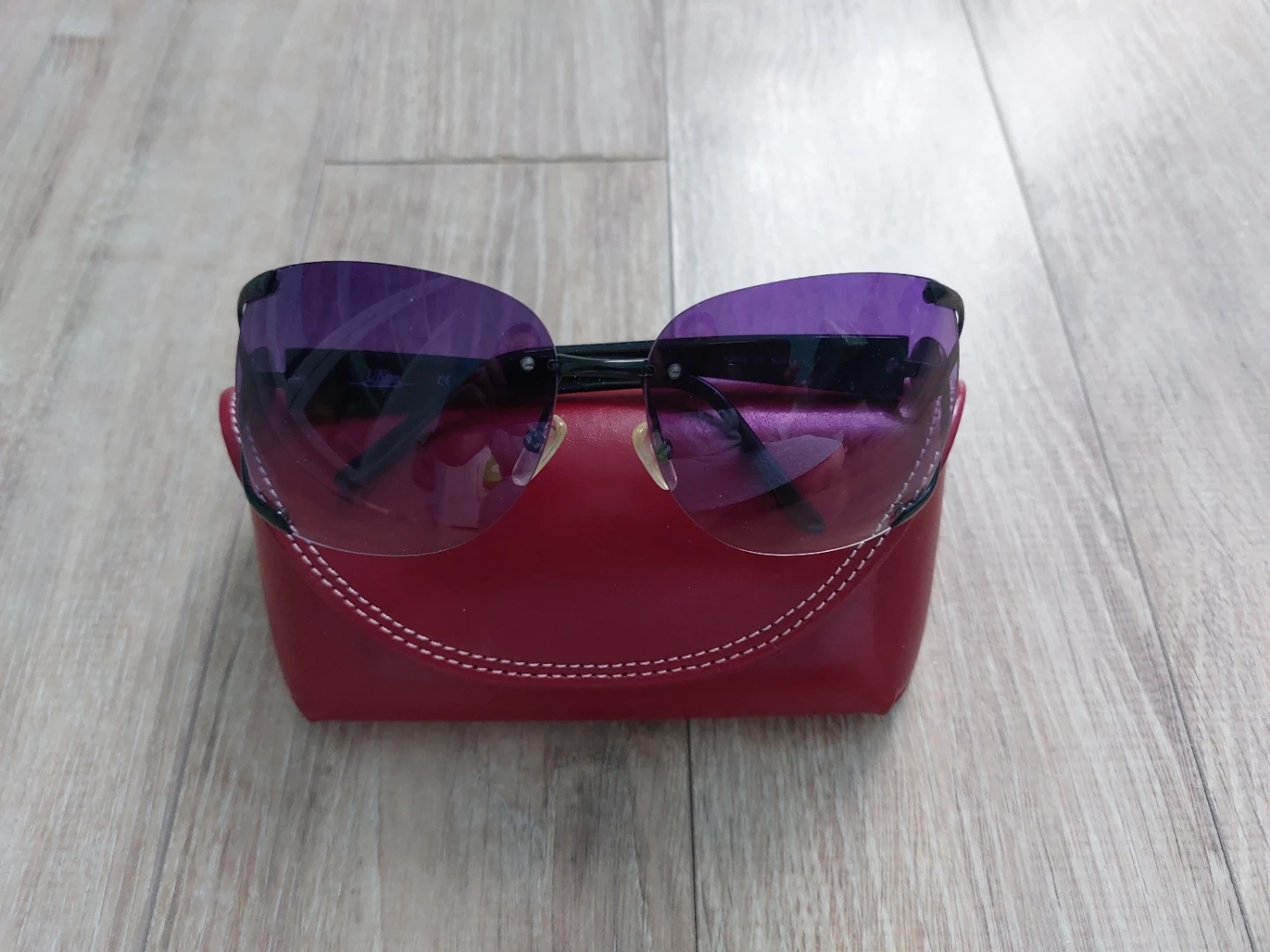 - Stylish rimless sunglasses with a red protective case