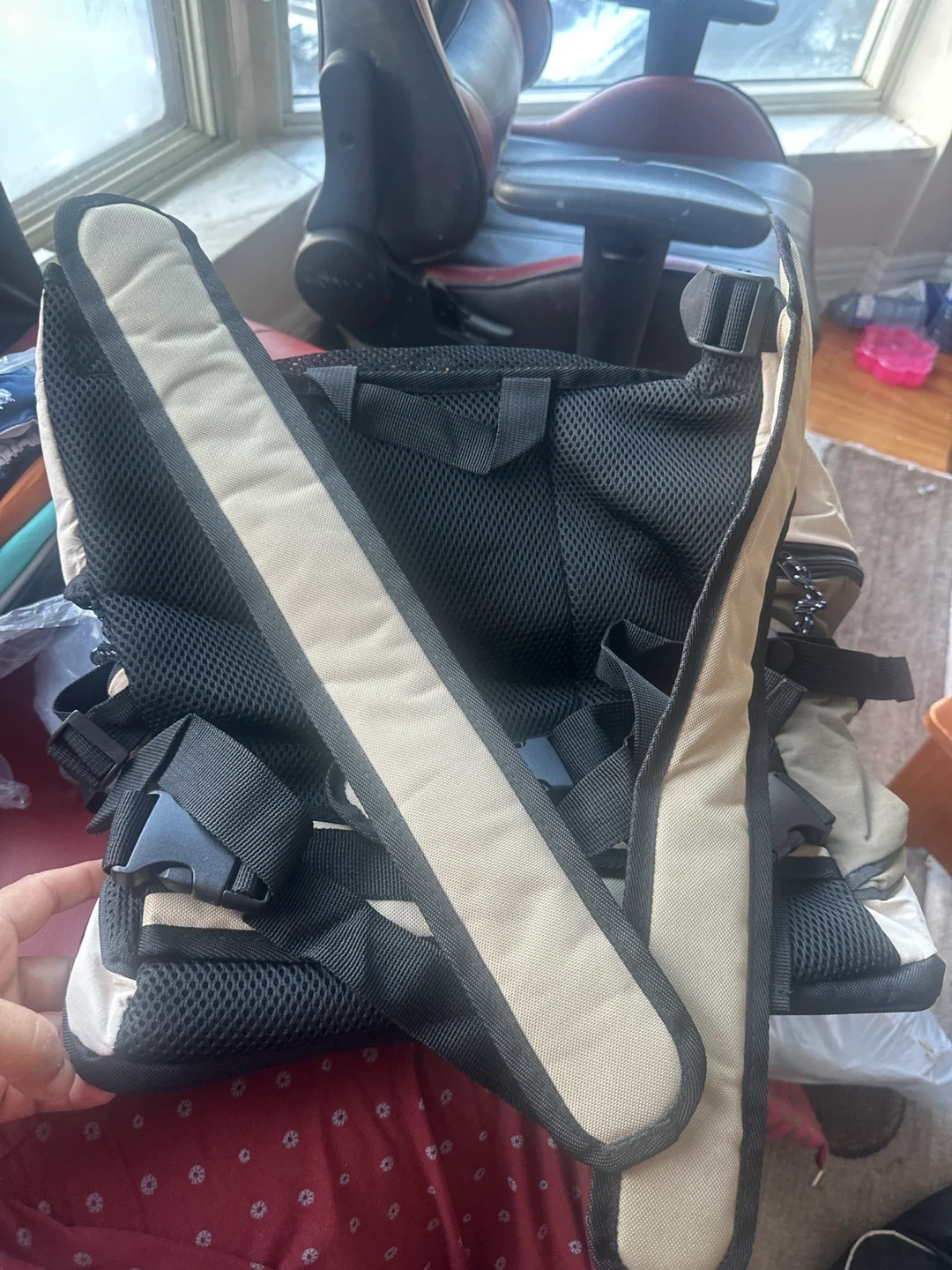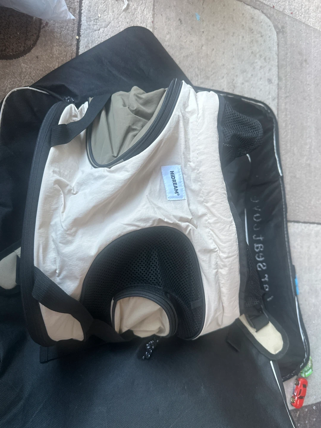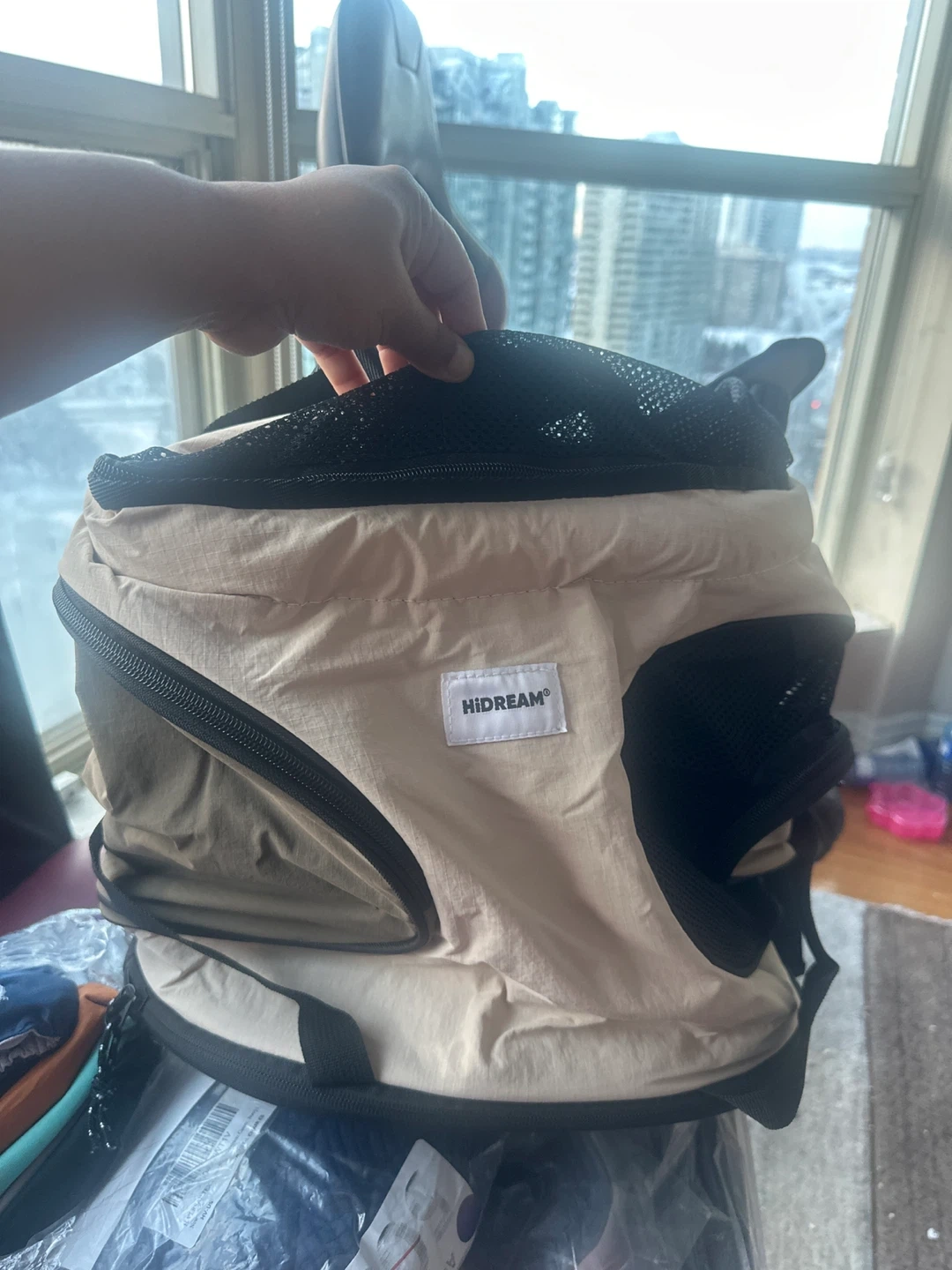 This is a HIDREAM pet carrier backpack in beige and black. It's made with mesh panels for ventilation. It's suitable for carrying small pets on the go.