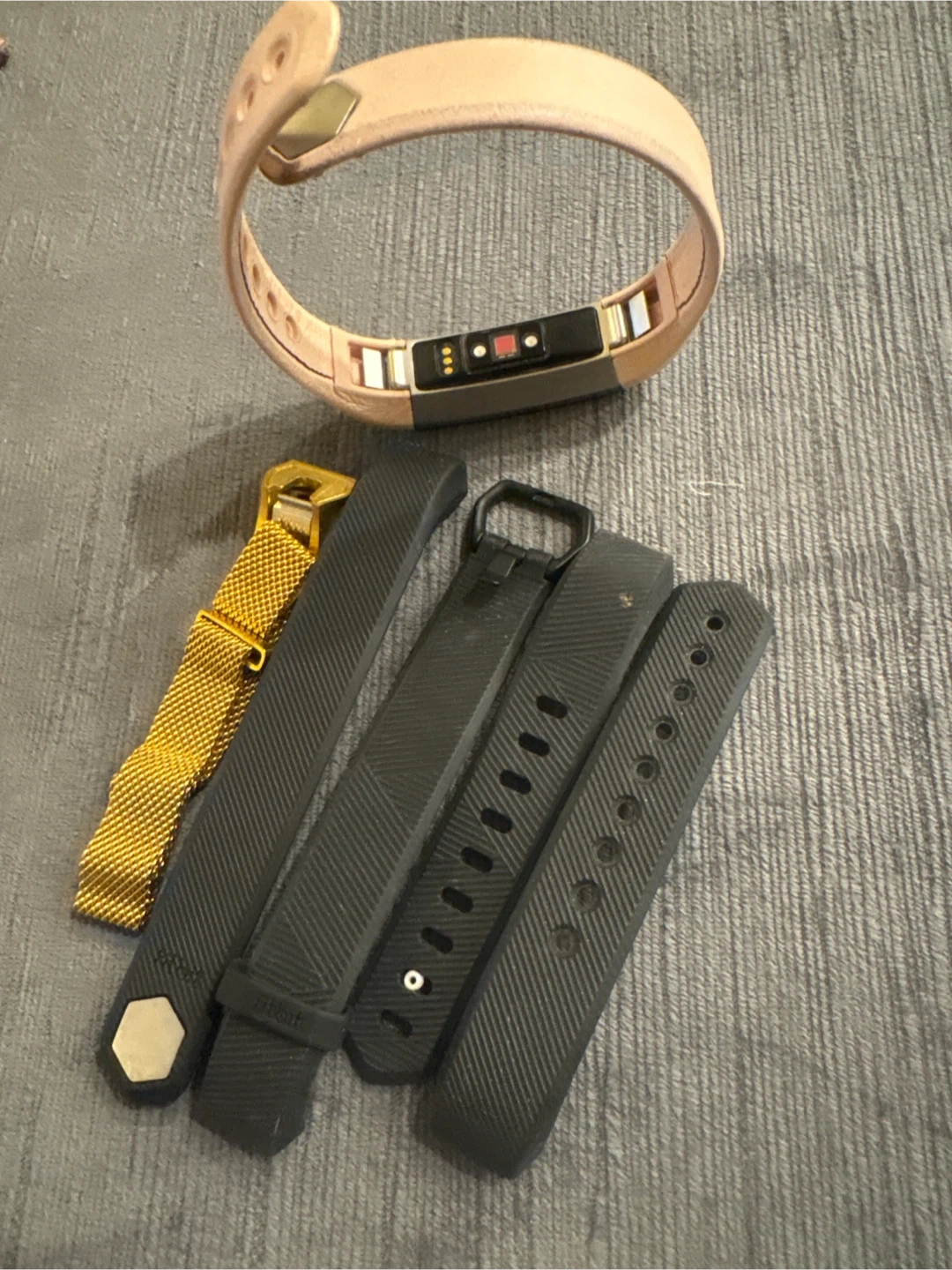 Fitbit Alta fitness tracker with multiple bands. Includes the original pink band, a gold mesh band, and three black sport bands. It's a great way to track your daily activity!