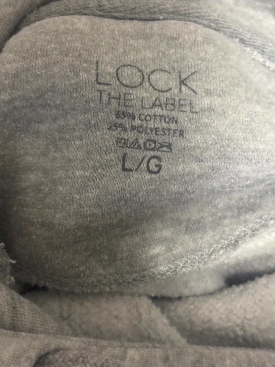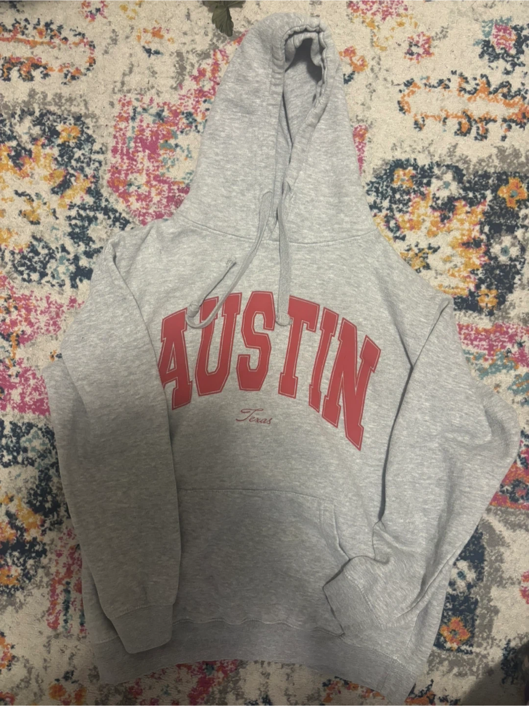 Grey hoodie with "Austin Texas" graphic. It's a size large. Material is 65% cotton and 35% polyester.