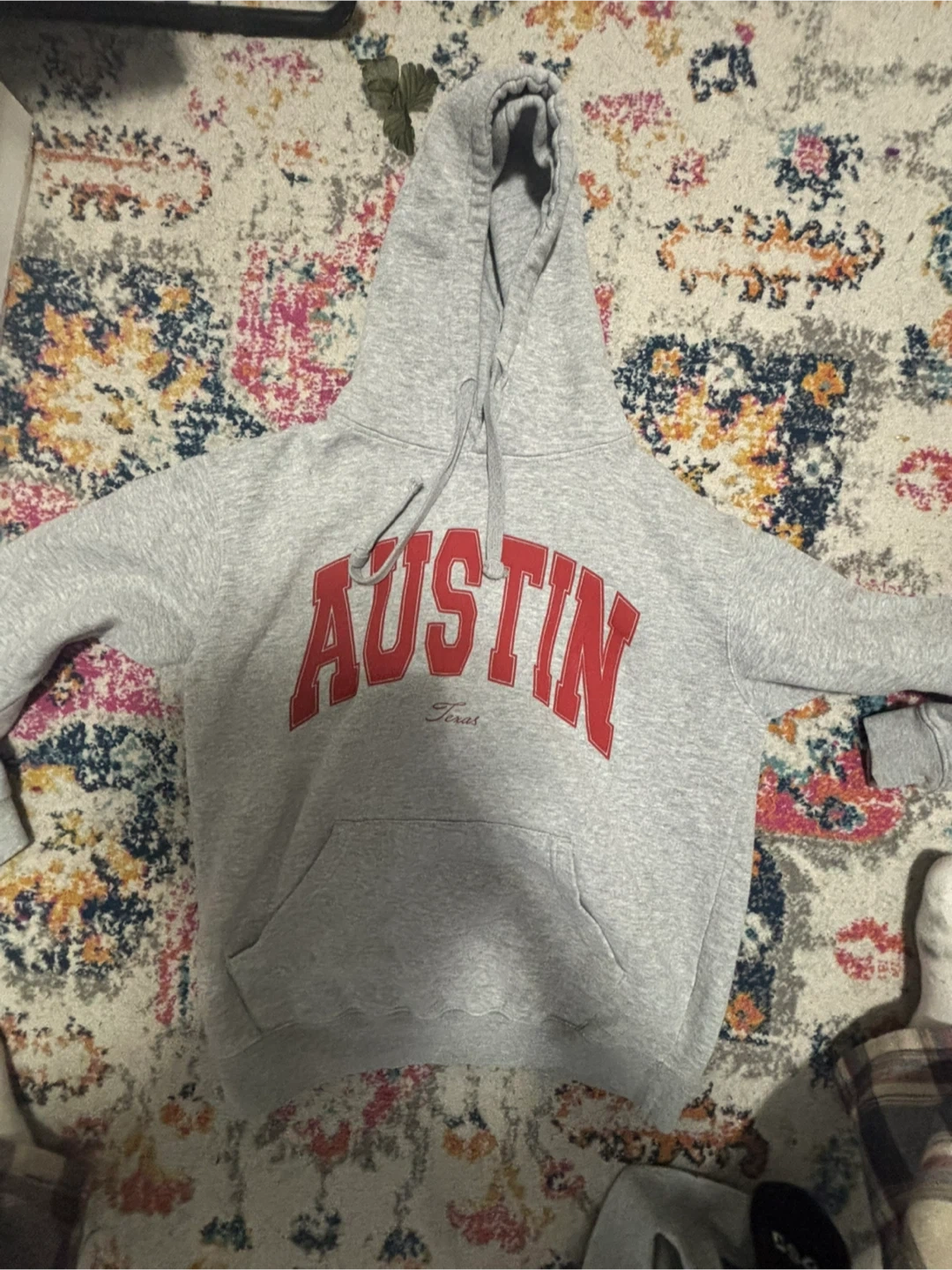 Grey hoodie with "Austin Texas" graphic. It's a size large. Material is 65% cotton and 35% polyester.