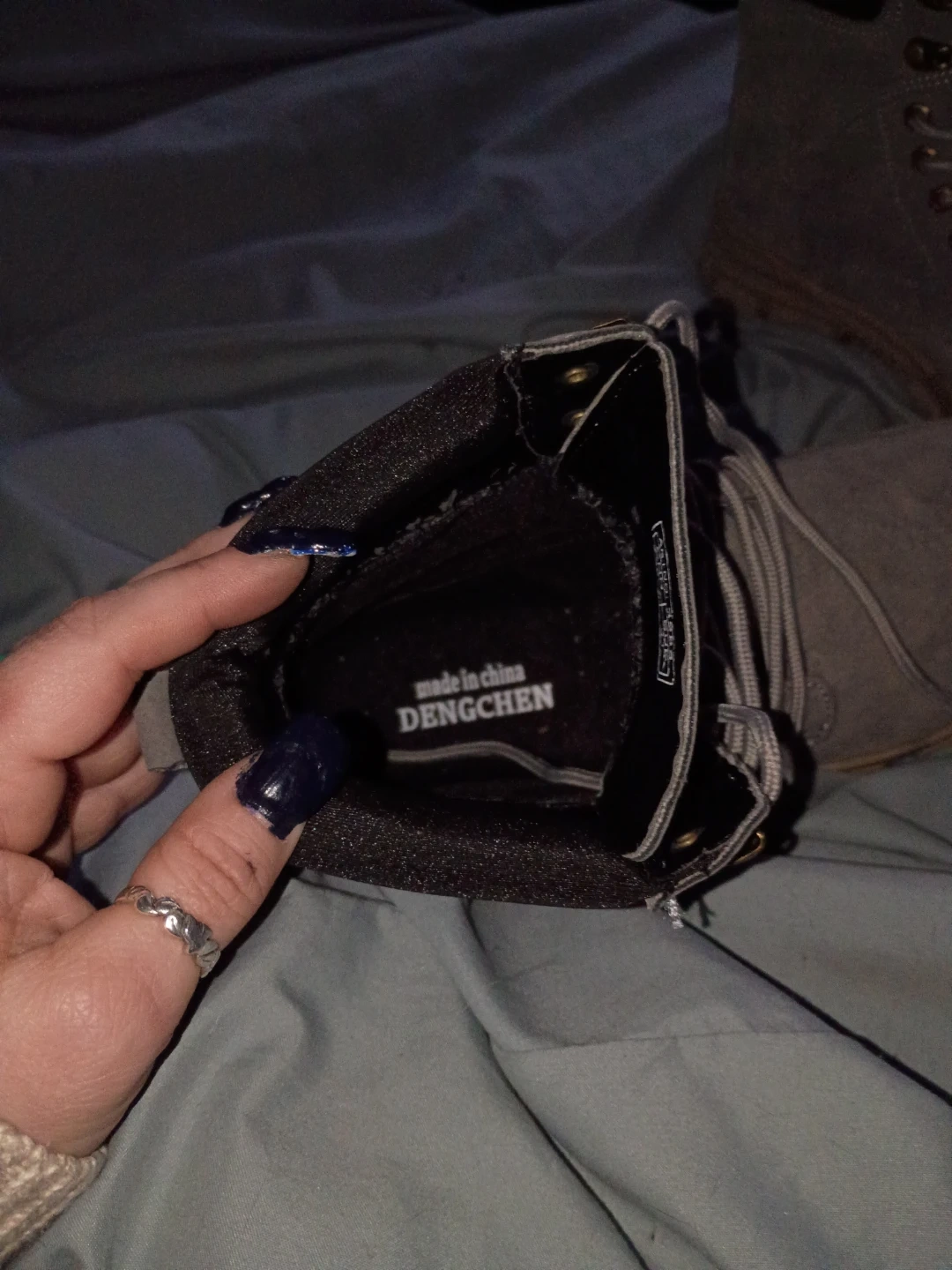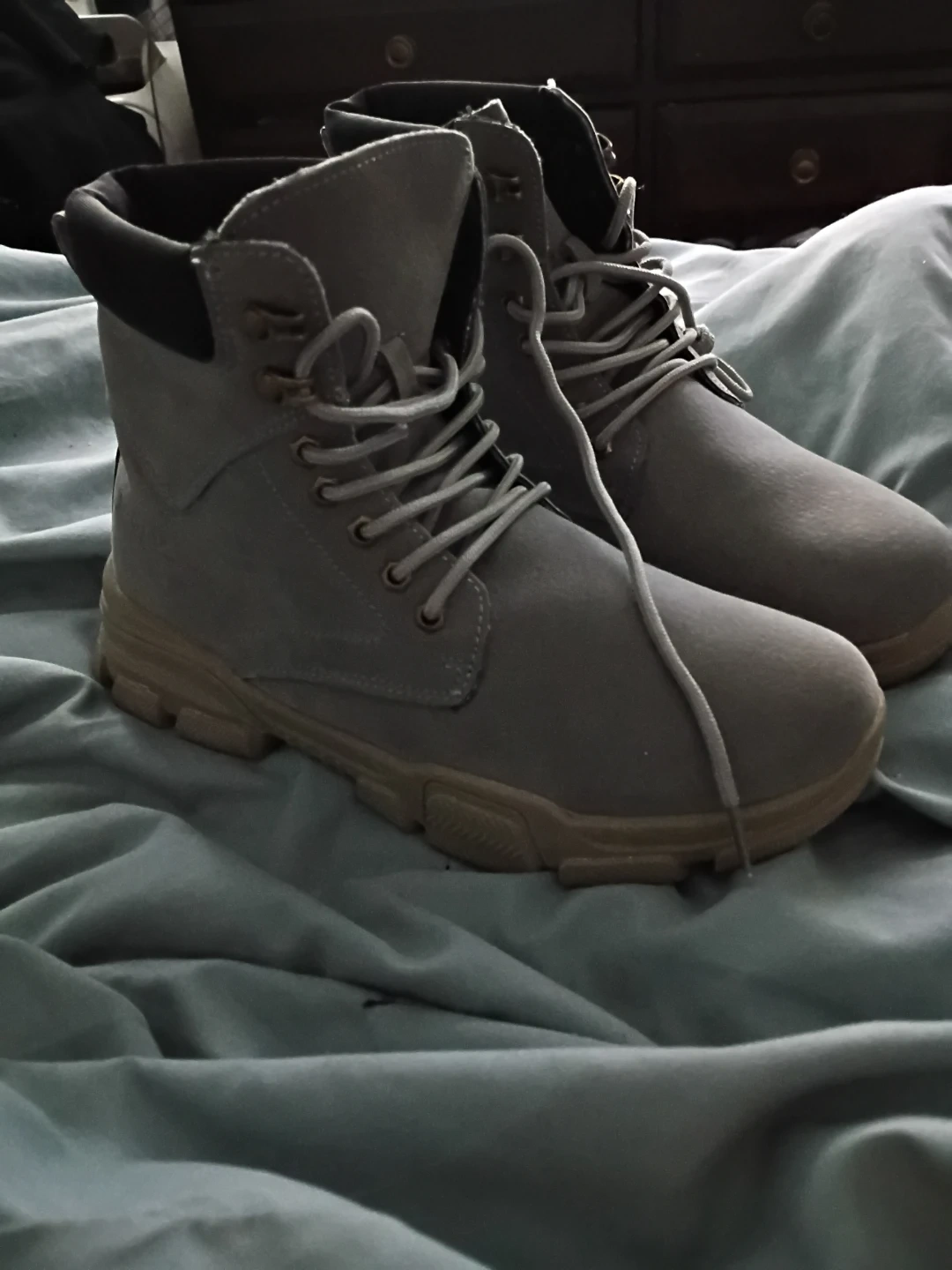These grey DENGCHEN winter boots are a size 41 EUR. They're made in China and feature a lace-up closure for a secure fit. The boots are grey with tan soles. Pick up only