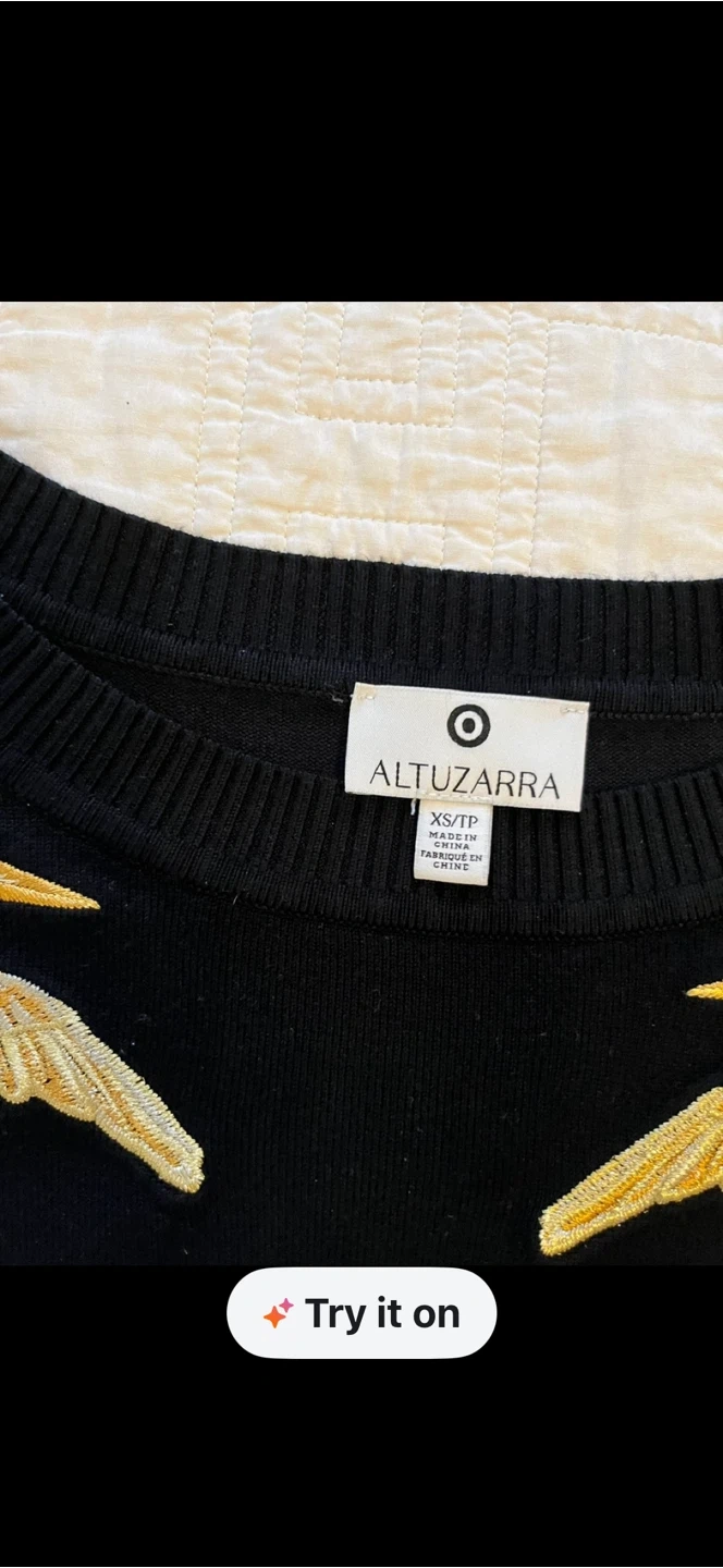 This black sweater features intricate gold crane embroidery on the front. It's made from a soft knit material. Size is XS/TP.